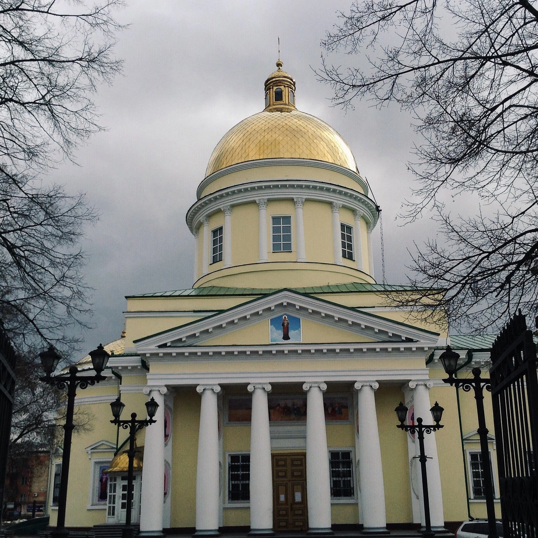 Главный фасад собора, выполненный в светлых торжественных тонах, обращён к зрителю. Центральный объём венчает массивный золочёный купол, установленный на высоком световом барабане, который символизирует небесную славу и горний мир. Купол увенчан традиционным православным крестом, возносящимся к пасмурному осеннему небу. К основному объёму храма примыкает монументальный портик с шестью колоннами дорического ордера, поддерживающими треугольный фронтон, что придаёт всему облику собора черты благородной строгости и классической гармонии.