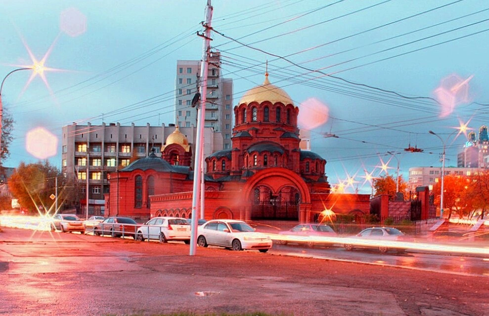 Перед собором видна оживлённая городская магистраль, где движение автомобилей, снятое на длинной выдержке, превратилось в гирлянды световых трасс, подчёркивающих динамику современной жизни вокруг древней святыни. Собор Александра Невского является кафедральным и имеет статус объекта культурного наследия народов России, оставаясь главным духовным центром Новосибирской митрополии.