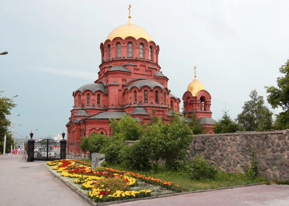 На фотографии запечатлен величественный Собор во имя Святого Благоверного Князя Александра Невского, расположенный в самом сердце Новосибирска. Этот православный храм, возведенный в неовизантийском стиле, является не только духовным центром, но и одним из старейших каменных зданий города, историческим символом и архитектурной доминантой.
