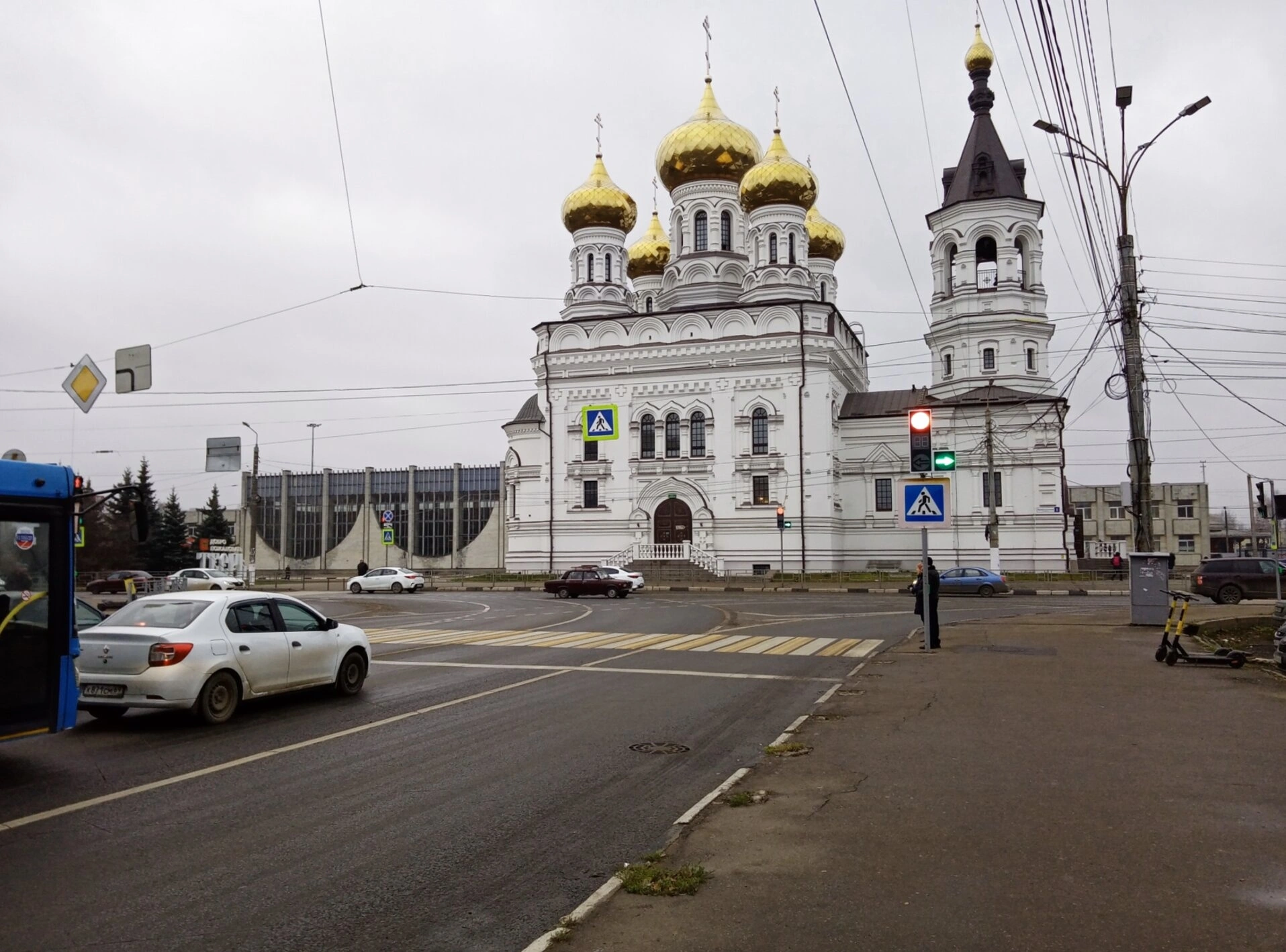 На переднем плане фотографии виден оживлённый городской перекрёсток с движением автомобилей и пешеходов, что символически подчеркивает соединение мирской суеты и вечных духовных ценностей. Светофоры, дорожная разметка и современный транспорт контрастируют с величавым образом дом Божьего, напоминая о непреходящем значении веры в жизни человека.