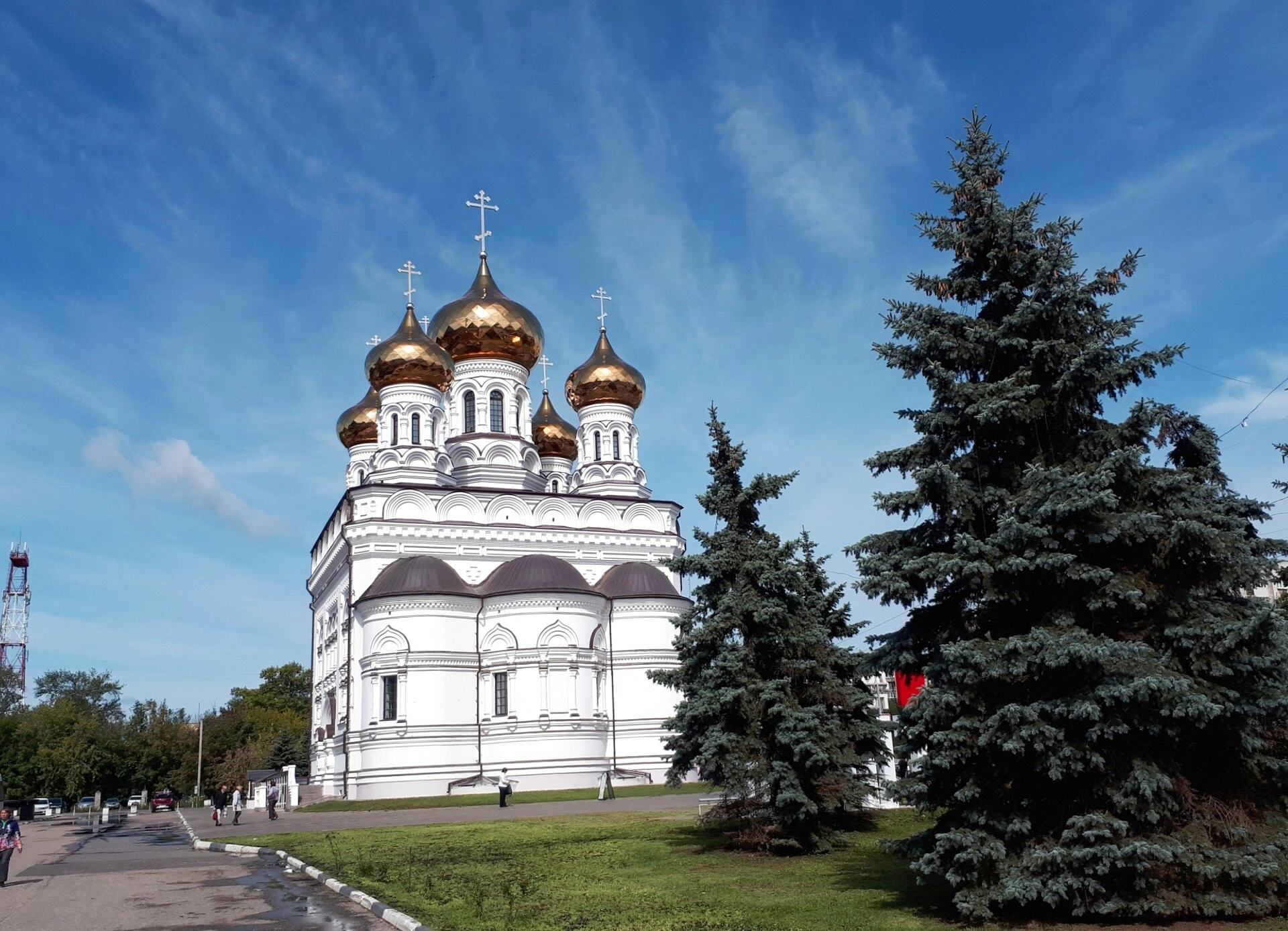 Справа на переднем плане возвышаются стройные ели, подчёркивая своим вечнозелёным убранством благолепие святыни. С левой стороны к собору ведёт благоустроенная пешеходная дорожка, по которой православные верующие направляются к богослужению. На заднем плане просматриваются элементы городской инфраструктуры, включая вышку связи, что указывает на гармоничное соседство духовного центра с мирской жизнью города.