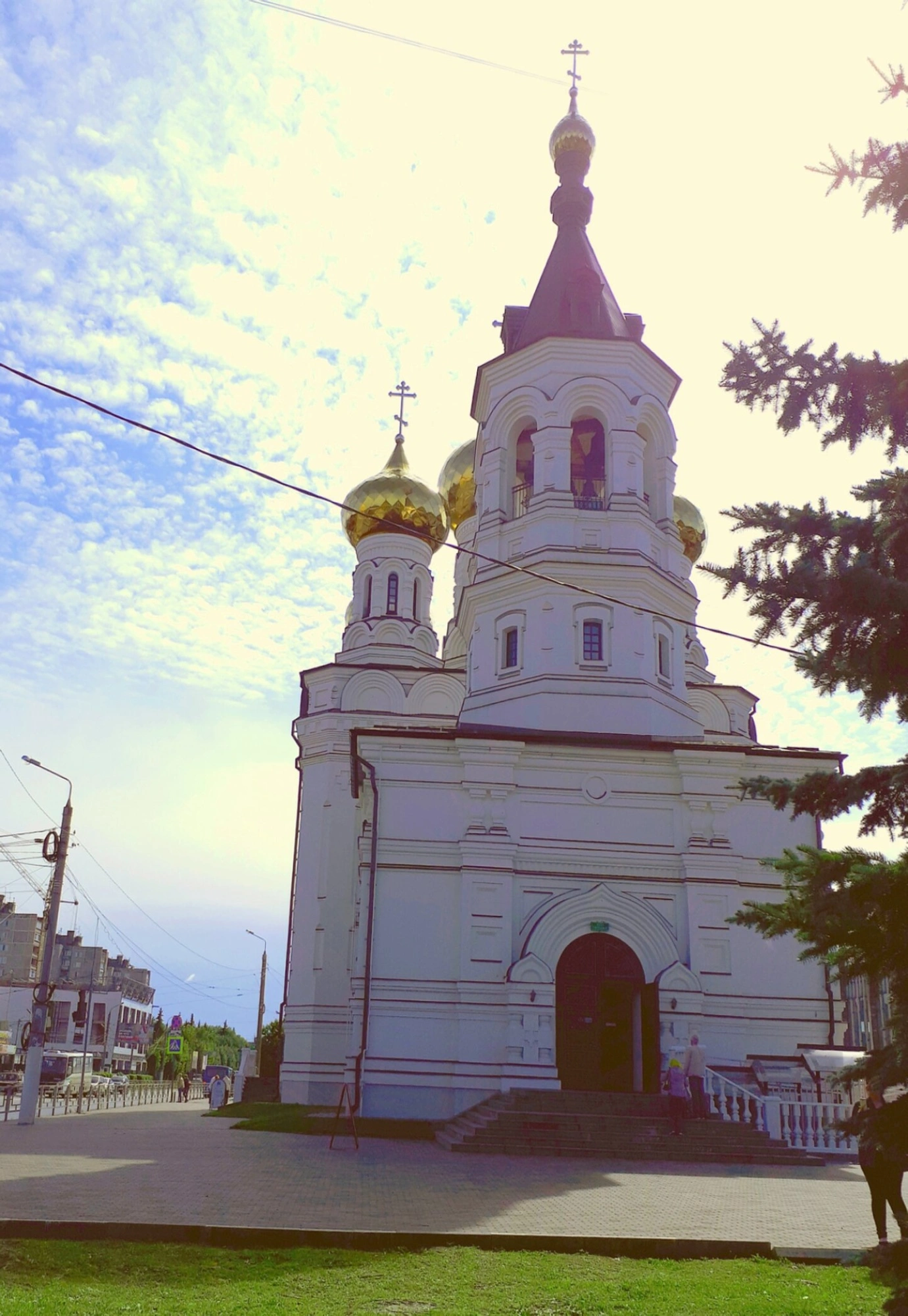 На представленной фотографии запечатлён величественный собор во имя святого благоверного князя Александра Невского, находящийся в городе Твери. Белоснежные стены храма, увенчанные златоглавыми куполами, сияют под лучами солнца, что создаёт ощущение благодати и духовной торжественности. Тёмная шатровая колокольня гармонично дополняет архитектурный ансамбль, устремляясь ввысь к частично облачному небу.