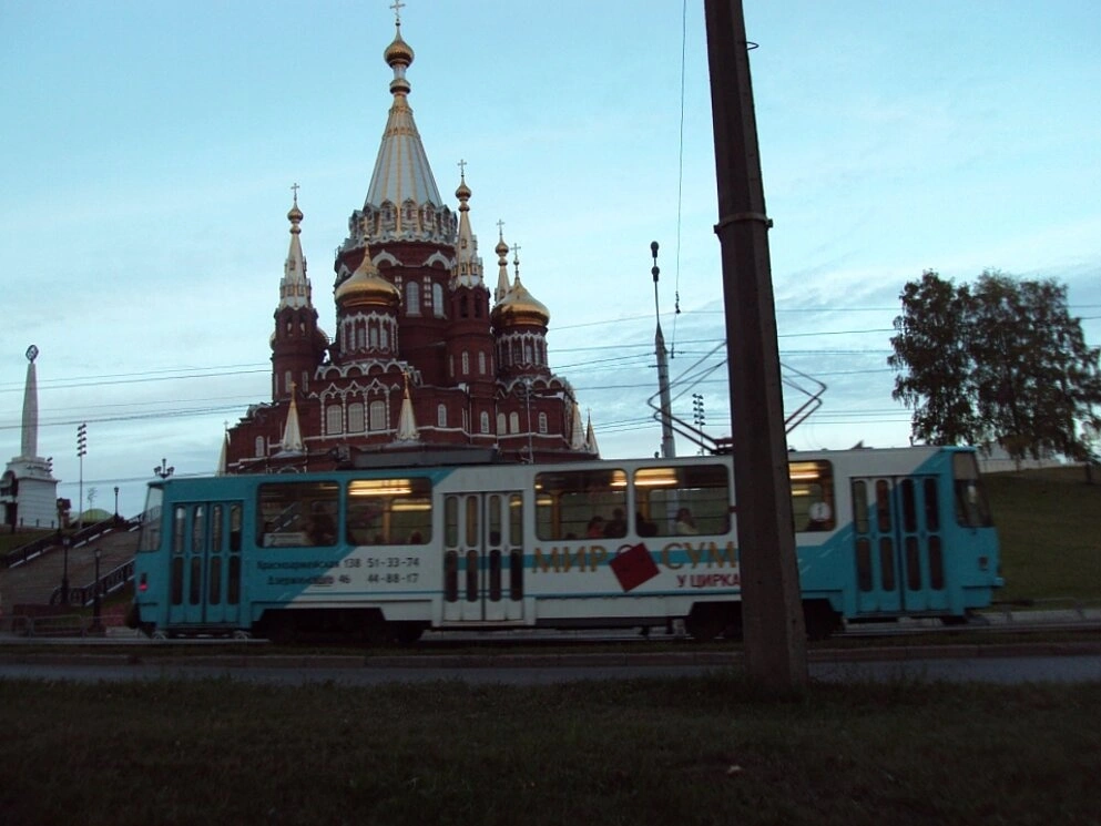 Храм, исполненный в красно-кирпичной гамме, венчают сияющие золотом главы, устремлённые к небесам. Его монументальный образ, запечатлённый на снимке, создаёт ощущение незыблемости веры и благодати. Проезжающий мимо вагон ижевского трамвая подчёркивает, что святой собор не является музеем, но живёт полной жизнью в сердце современного промышленного города, оставаясь местом молитвы и духовного притяжения для тысяч верующих.