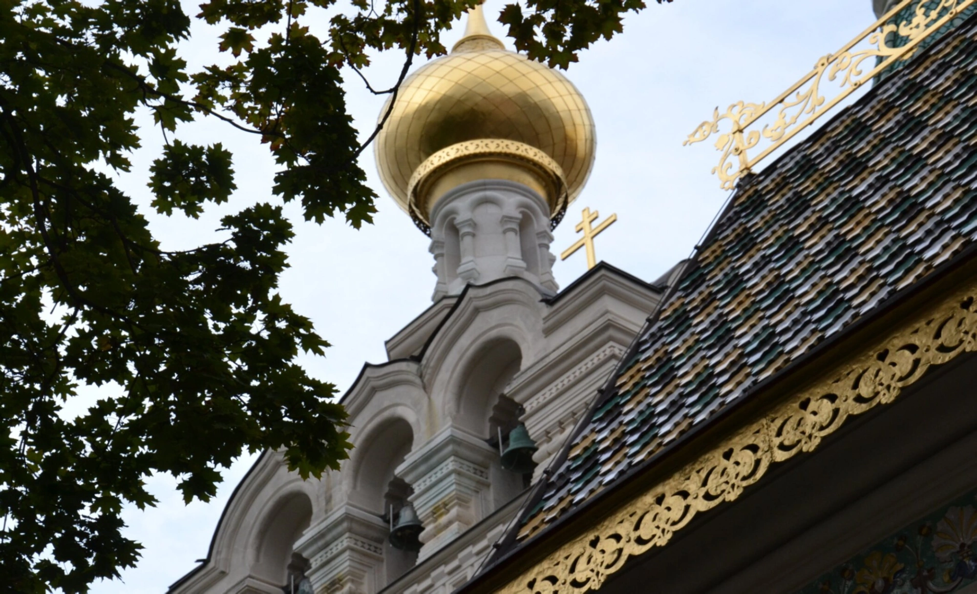 На переднем плане фотографии видны церковные колокола, размещённые на кованых опорах рядом с куполом. Их лаконичные формы и тёмный металл создают благочестивый контраст с сиянием позолоты, подчёркивая единство силы веры и духовной красоты. Черепица на кровле храма также имеет сложный декоративный рисунок, что свидетельствует о высоком мастерстве архитекторов и строителей.