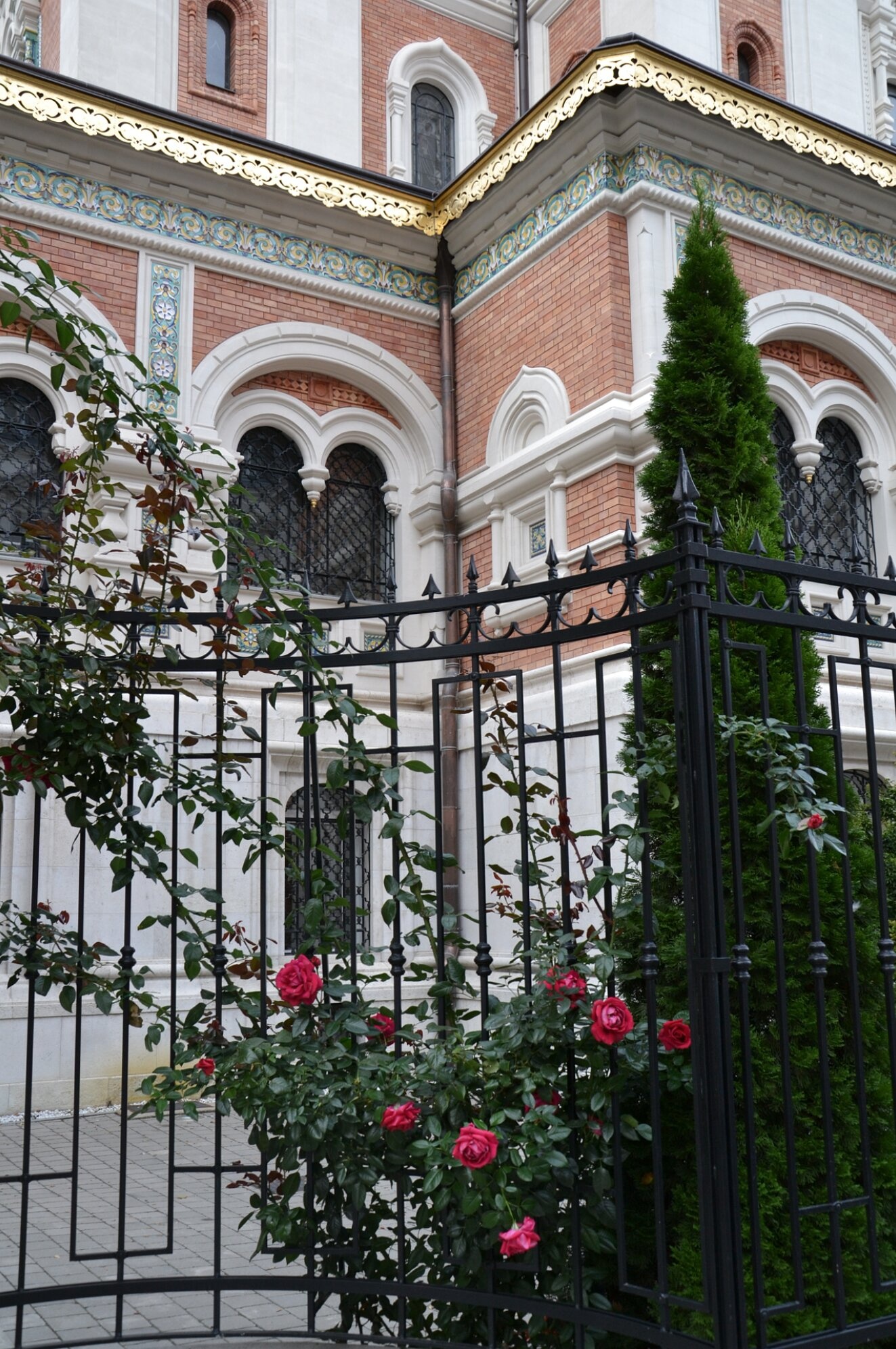 На снимке хорошо видны арочные оконные проемы, обрамленные изящными решетками. Праздничную атмосферу подчеркивает ухоженная прихрамовая территория. На переднем плане фотографии расположен кованый металлический забор, за которым виднеются кусты роз с алыми цветами и высокое хвойное дерево, символизирующее вечную жизнь. Этот умиротворяющий пейзаж гармонично дополняет святыню, создавая целостный образ духовного центра русской эмиграции в Австрии.