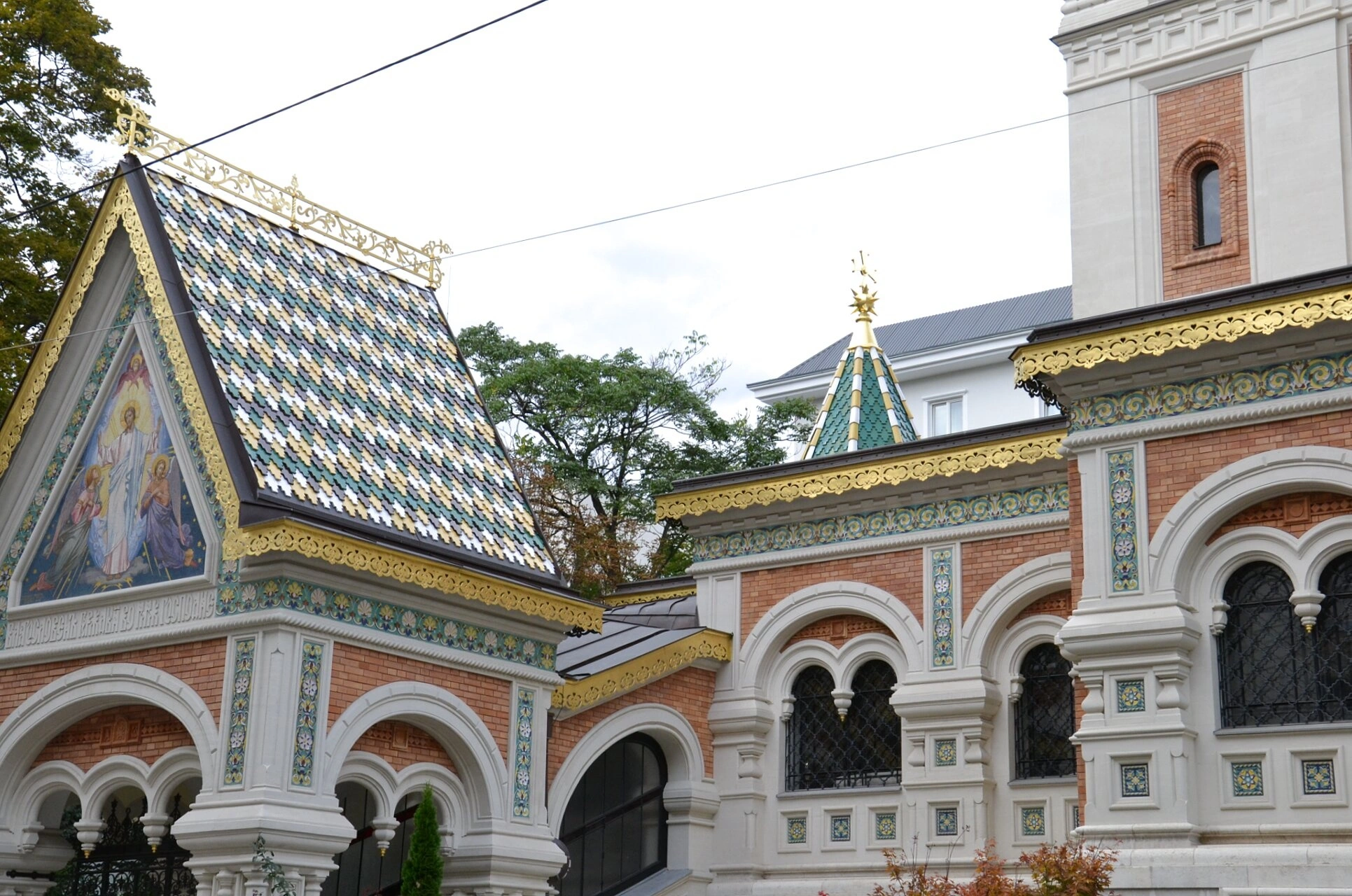 На фотографии запечатлён величественный фрагмент кафедрального собора Святого Николая Чудотворца в Вене, являющегося главным храмом Венской епархии Русской Православной Церкви. Храм, освящённый во имя небесного покровителя императора Николая II, был возведён в 1893–1899 годах по проекту академика архитектуры Григория Ивановича Котова в традиционном русско-византийском стиле.