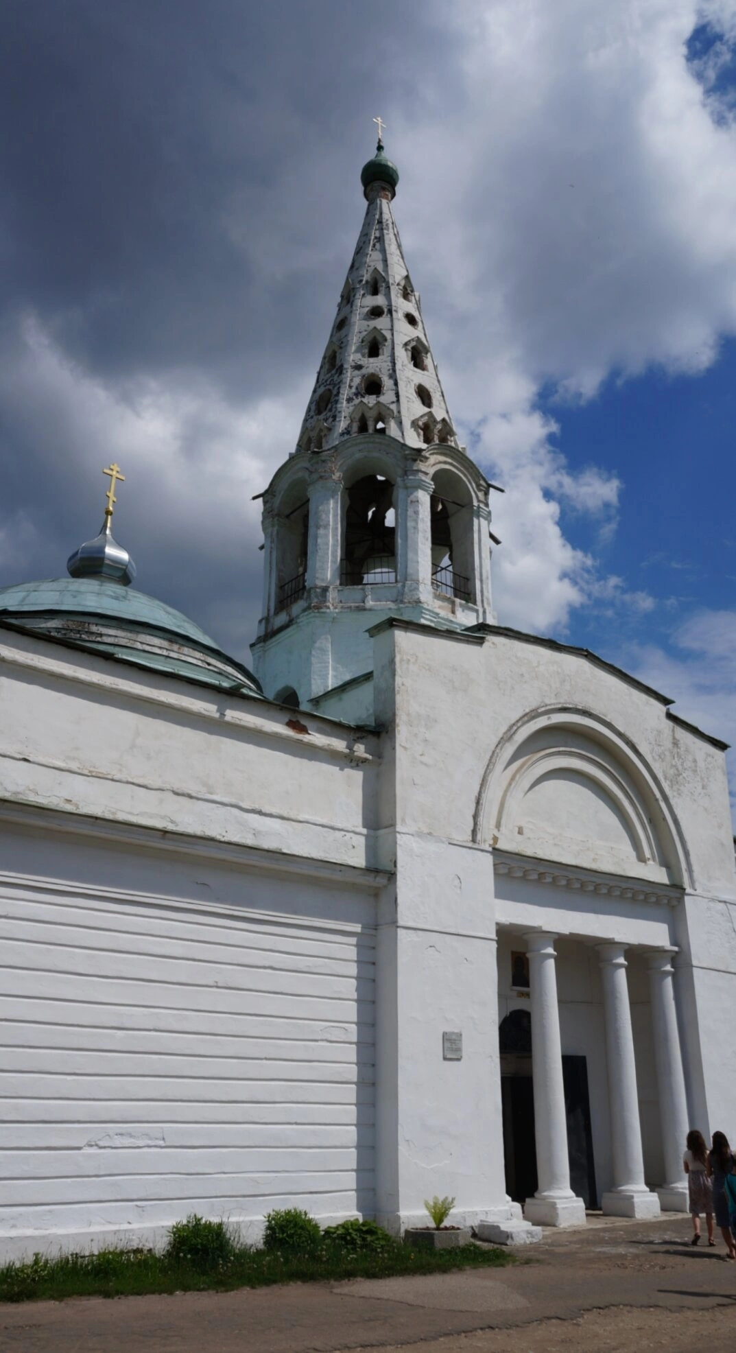 На снимке изображён фрагмент собора, демонстрирующий его торжественный вход и многоярусную колокольню. Белоснежный фасад украшен строгими колоннами и арочным проёмом, ведущим в святая святых храма. Высокая колокольня, устремлённая в небо, завершается остроконечным шпилем, увенчанным золочёным крестом, сияющим в лучах божественного света. Её ярусы прорезаны арочными проёмами, где размещаются колокола, чей звон разносится далеко над окрестностями.