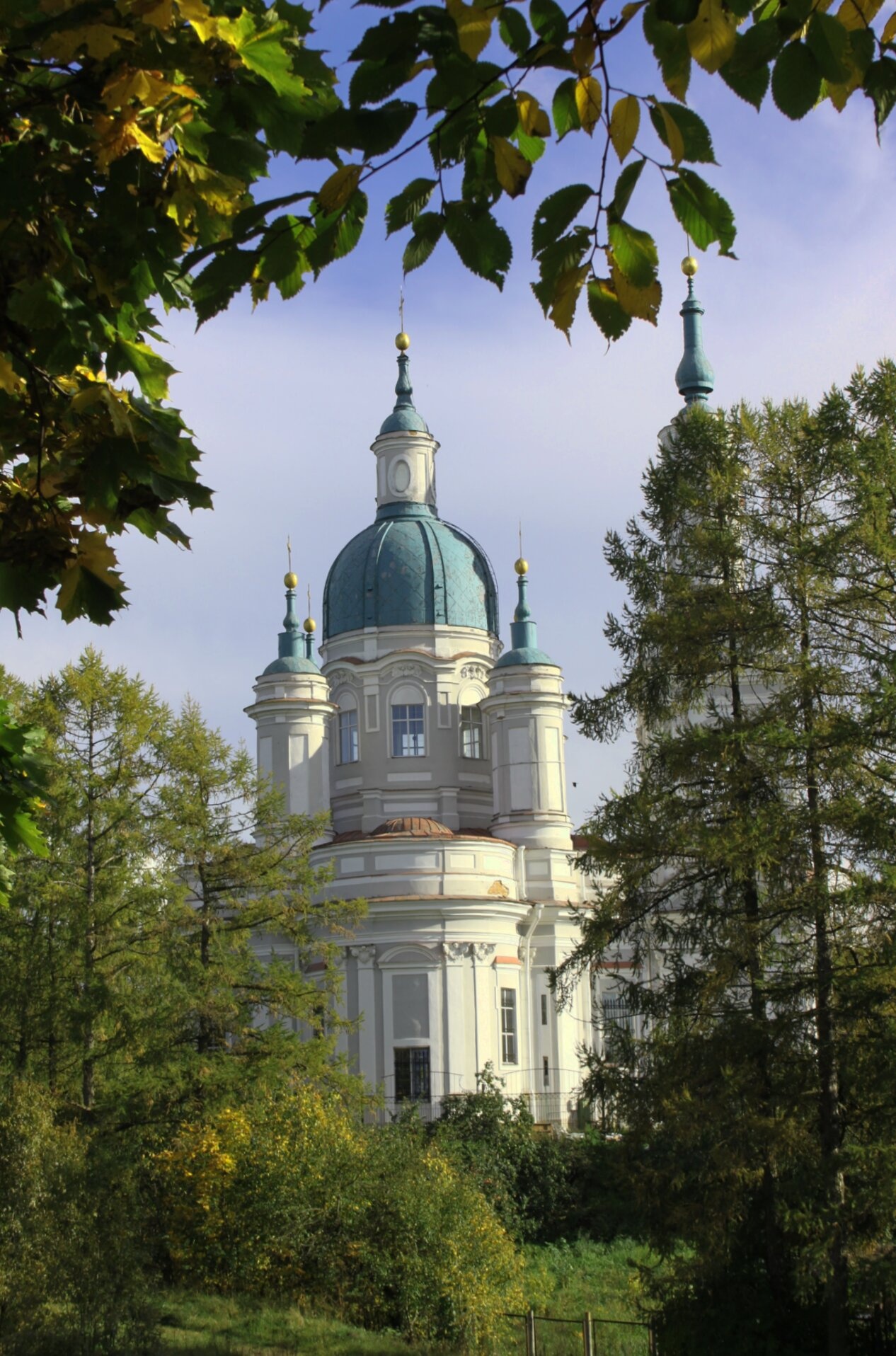 Фотография передаёт спокойную и умиротворённую атмосферу, окружающую святыню. Осенняя листва деревьев подчёркивает величие и монументальность собора, а его точёные силуэты ярко выделяются на фоне неба. Этот образ символизирует незыблемость православной веры и непрерывность духовной традиции на земле Ижорской.