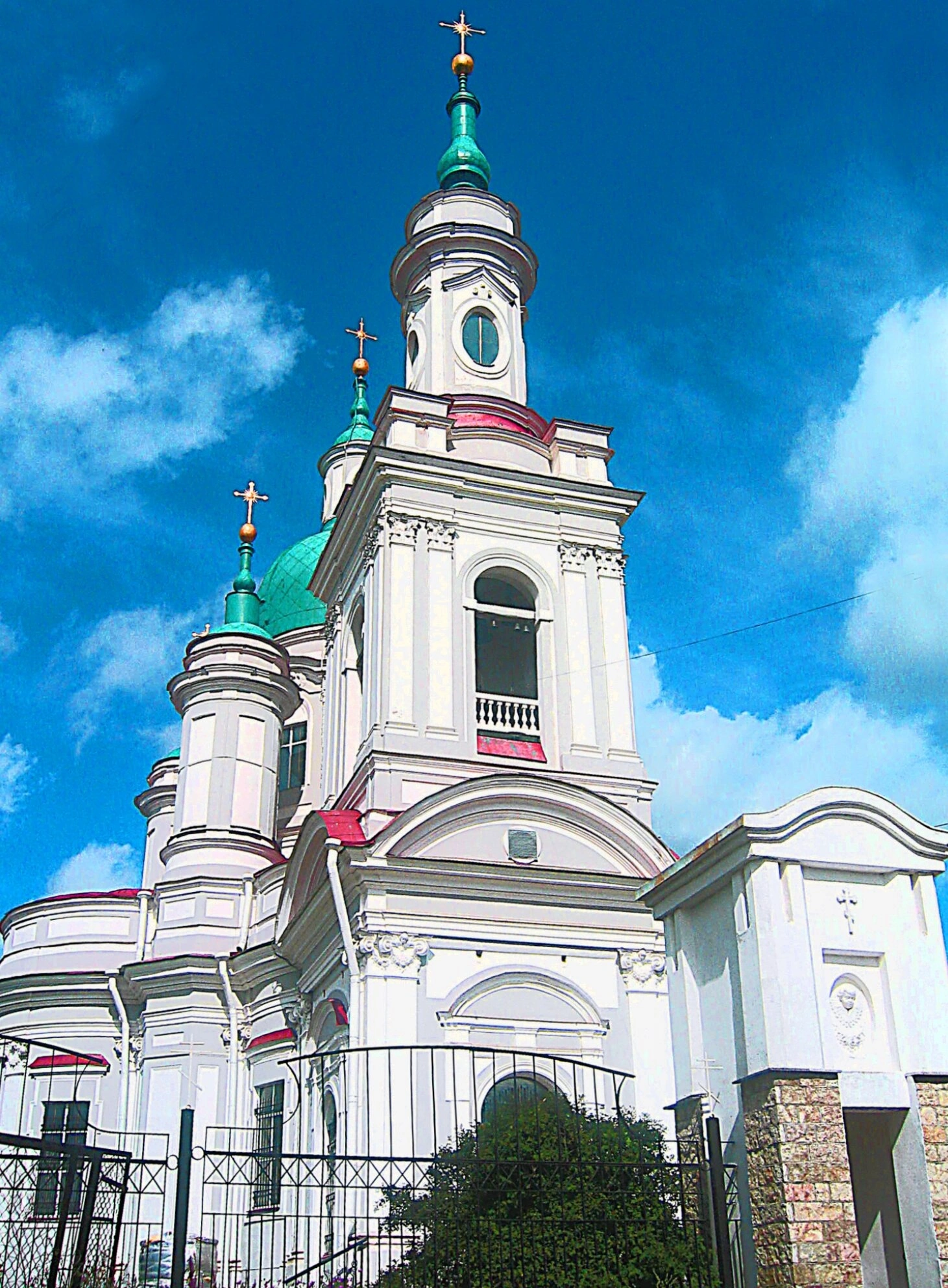 На фотографии прекрасно просматривается торжественный и нарядный облик собора. Белоснежные стены храма украшены изящными пилястрами и колоннами, а также декоративной лепниной, характерной для екатерининской эпохи. Арочные оконные проёмы с коваными решётками подчёркивают монументальность сооружения. Особое величие собору придают бирюзовые купола, увенчанные златоглавыми маковками и сияющими православными крестами. Центральный световой барабан с большими окнами является композиционным центром всего здания.