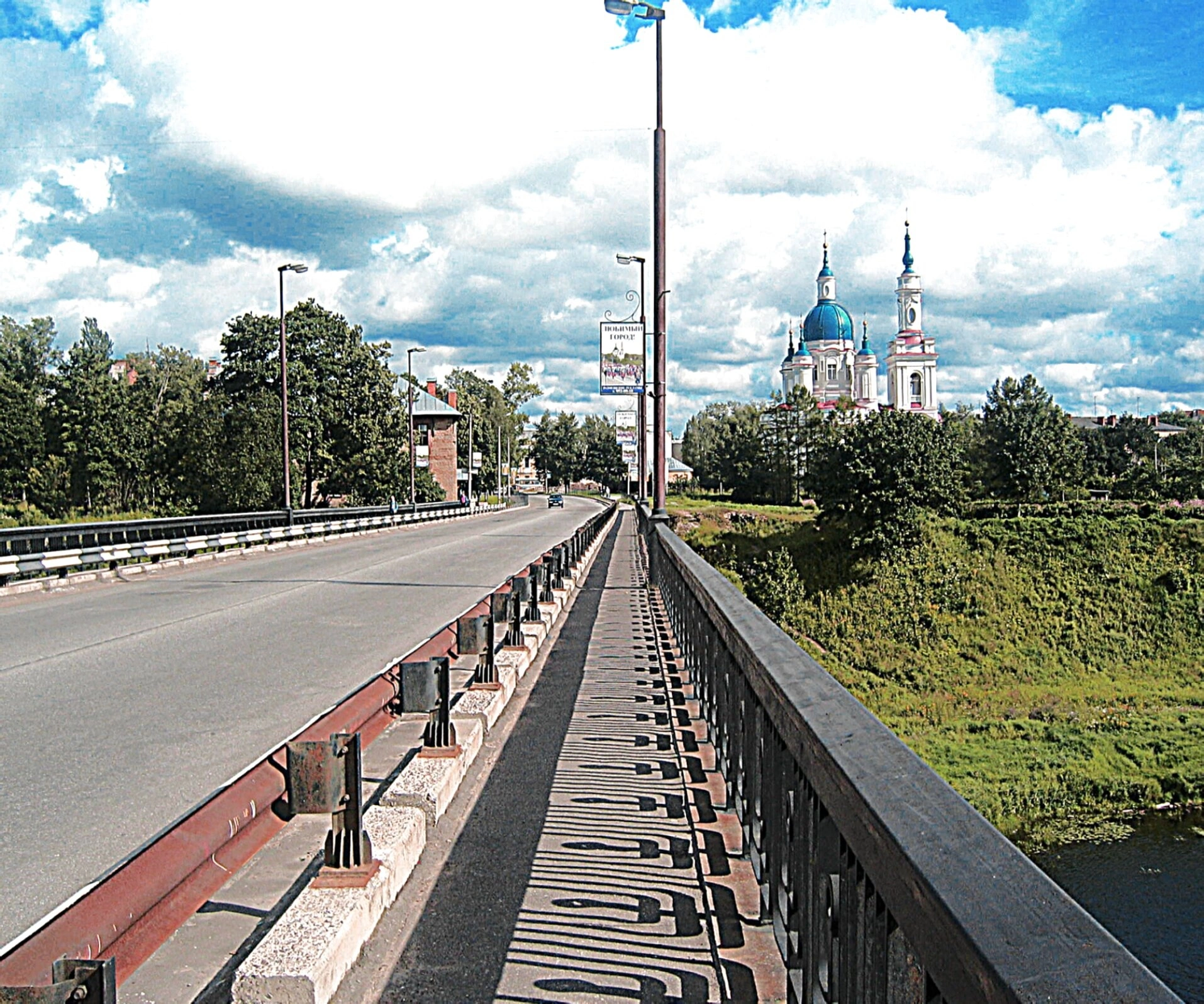 На фотографии запечатлён величественный Екатерининский собор, расположенный в городе Кингисеппе на берегу реки Луги. Этот действующий православный храм является выдающимся памятником церковной архитектуры XVIII века и главной духовной доминантой города.