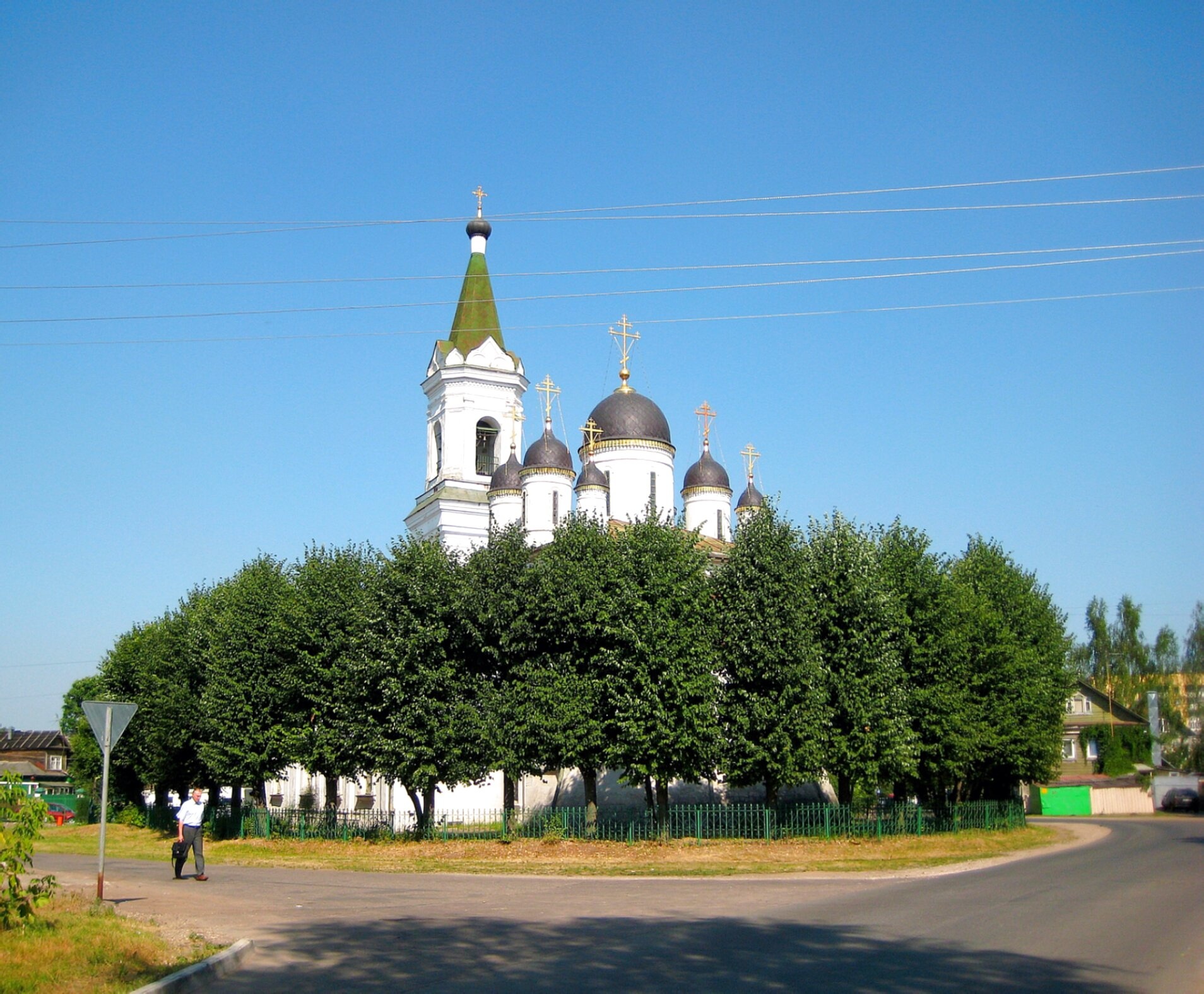 Святыня благоговейно окружена кронами высоких деревьев, которые словно природная ограда хранят её покой и уединение. На переднем плане фотографии виднеется городская дорога и пешеходная зона, а также фигуры прихожан и паломников, что подчёркивает не только историческую, но и живую, современную значимость этого места для горожан. Собор является кафедральным и хранит в своих стенах чтимые святыни, включая мощи преподобного Макария Калязинского.