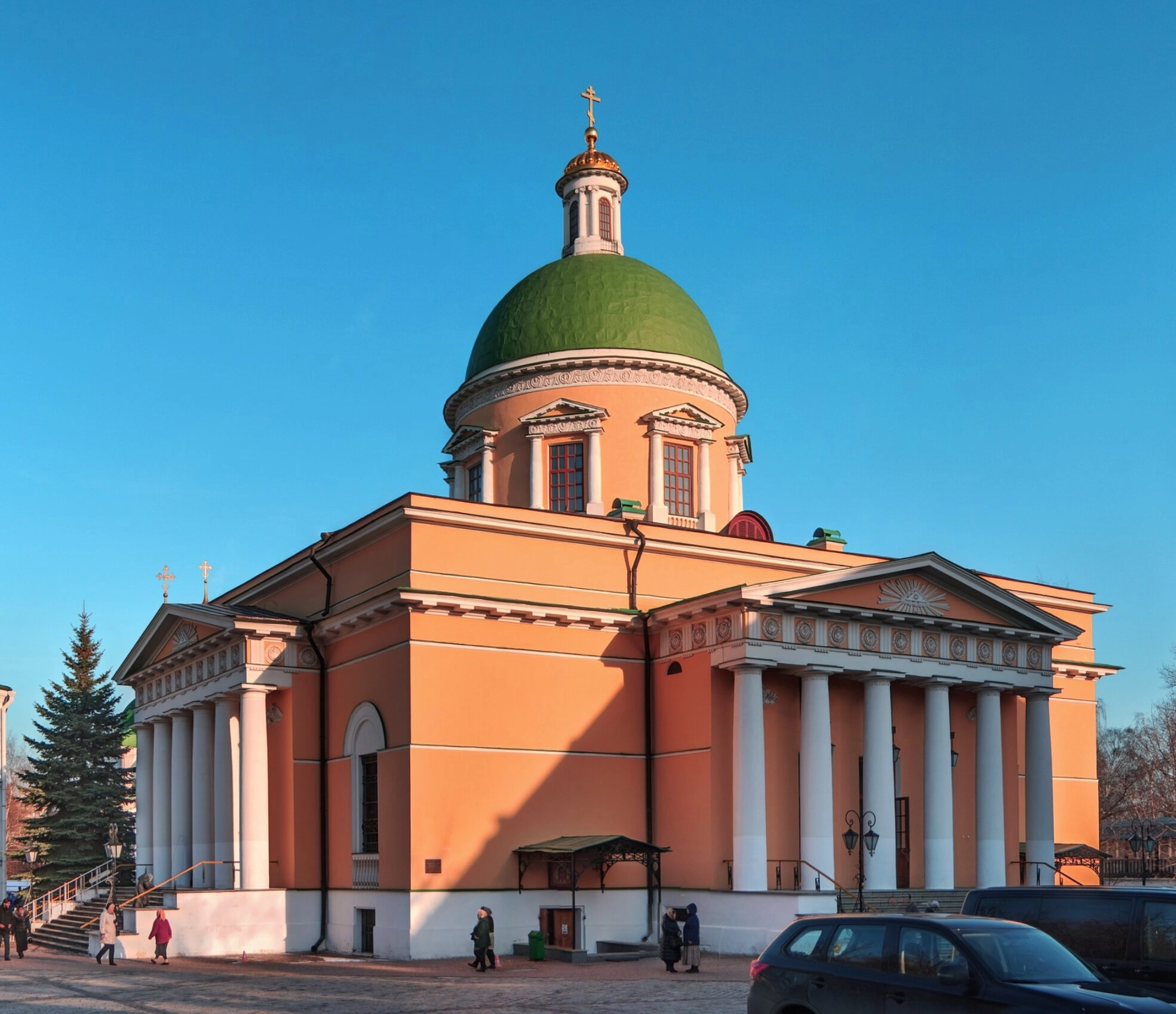 На фотографии запечатлён собор Троицы Живоначальной, являющийся главным храмом Свято-Данилова ставропигиального мужского монастыря в Москве. Величественное здание собора, выполненное в стиле позднего ампир, представляет собой образец церковной архитектуры первой половины XIX века. Храм обладает строгой осевой симметрией и завершается монументальной купольной ротондой, увенчанной золочёным крестом, который символизирует победу жизни над смертью.