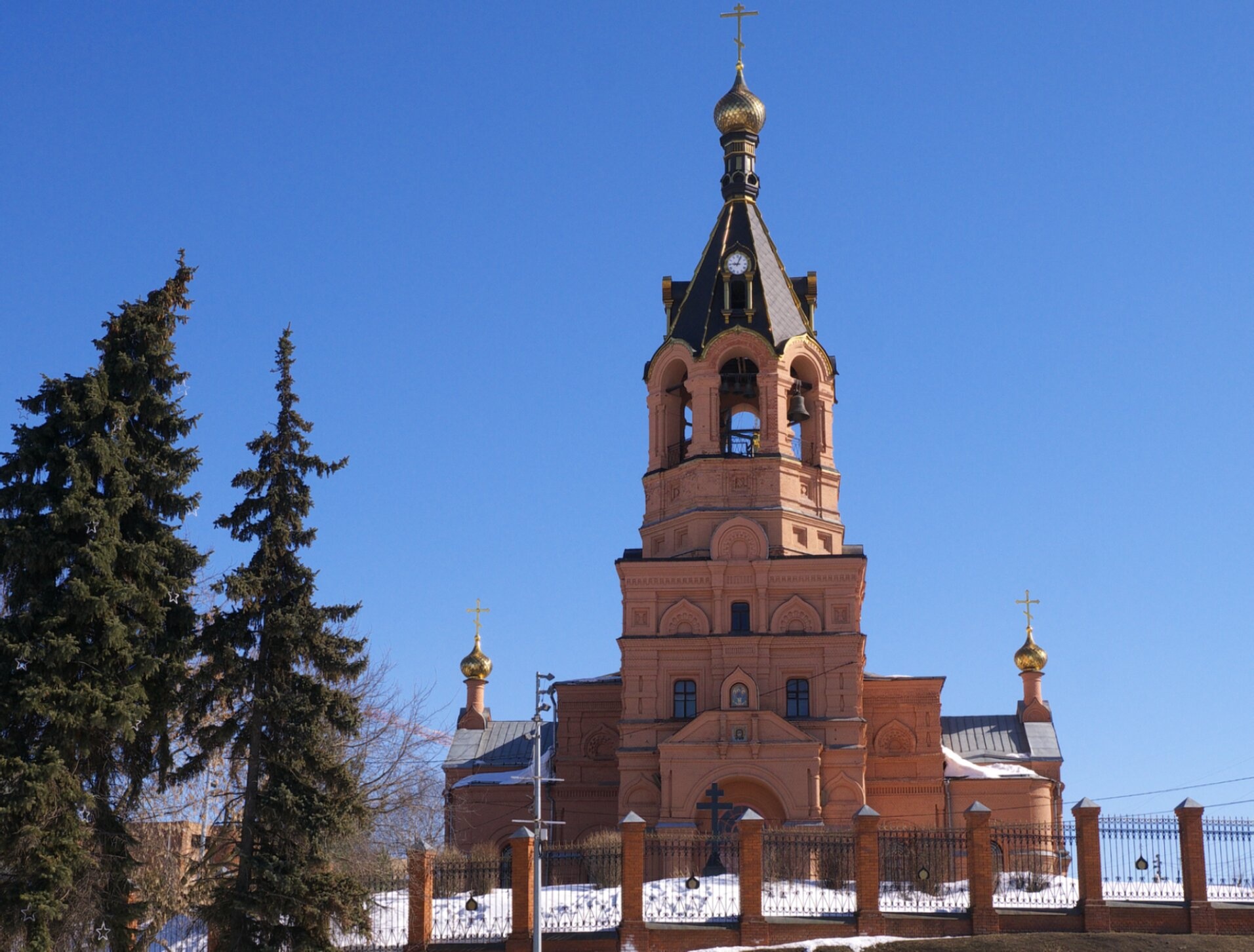 Архитектурный облик собора характерен для русского церковного зодчества конца XIX – начала XX века. Доминантой комплекса является высокая многоярусная колокольня, увенчанная массивным золочёным куполом. На её фасаде хорошо видны церковные часы. Основной объём храма завершается мощным световым барабаном с луковичной главой, также покрытой сусальным золотом. Снимок позволяет рассмотреть изящные детали фасада: арочные оконные проёмы, килевидные кокошники и другие элементы, придающие зданию торжественный и праздничный вид.