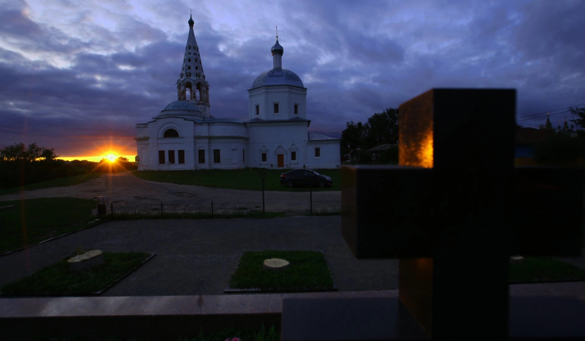 На представленной фотографии запечатлен величественный Троицкий собор, расположенный на исторической Соборной горе в Серпухове. Снимок сделан в час заката, когда уходящие за горизонт солнечные лучи озаряют белокаменные стены храма, создавая торжественную и одухотворенную атмосферу. Тёмный силуэт креста на переднем плане символично обрамляет вид на древнюю святыню, подчёркивая её сакральное значение.