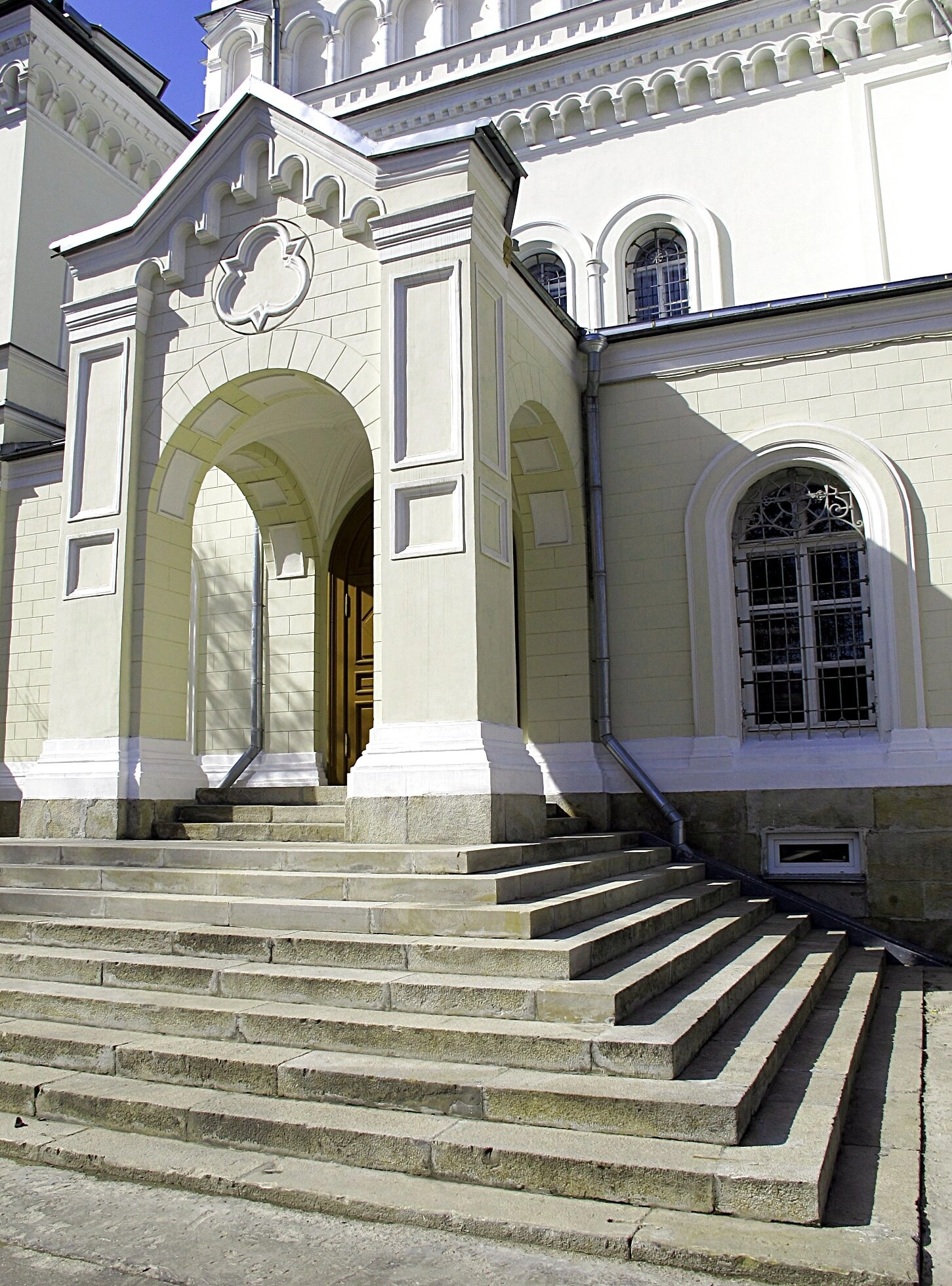 На представленной фотографии запечатлён собор Усекновения Главы Иоанна Предтечи, являющийся главным храмом Иоанно-Предтеченского ставропигиального женского монастыря в Москве, более известного как Ивановский монастырь. Снимок выполнен с южной стороны и показывает входную группу храма, демонстрируя его величественный архитектурный облик.