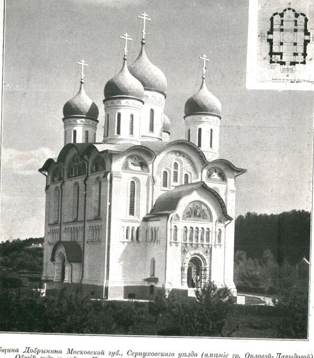 На представленной фотографии запечатлен величественный Собор Успения Пресвятой Богородицы, расположенный в бывшей усадьбе графини Орловой-Давыдовой в селе Добрыниха Серпуховского уезда Московской губернии. Храм был возведен в начале XX века по проекту известного московского архитектора-академика Сергея Устиновича Соловьева, о чем свидетельствует подпись под изображением.