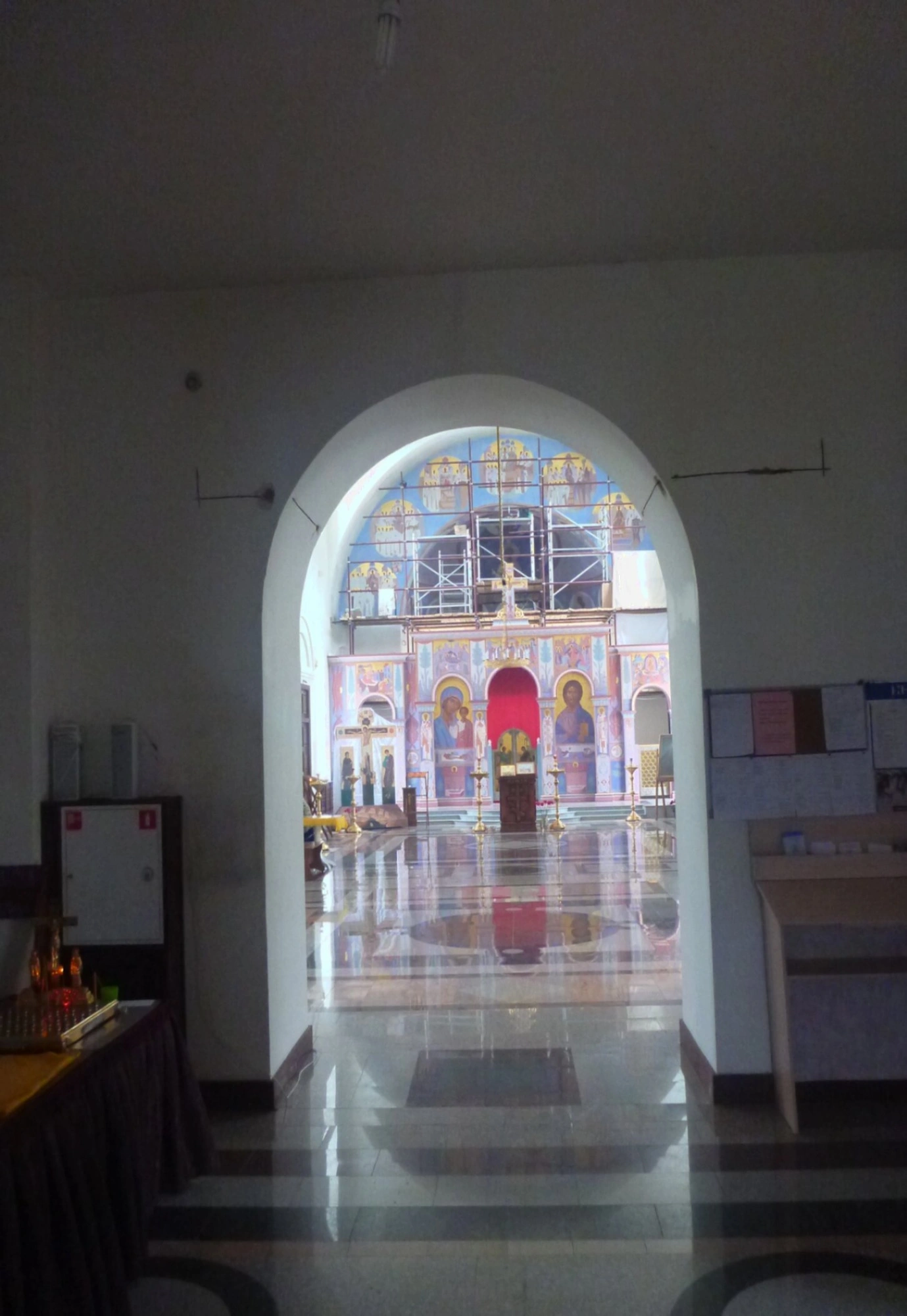 Фотография запечатлела величественный вид из притвора в главное пространство собора в честь Успения Пресвятой Богородицы, что в Екатеринбурге. Кадр выстроен через мощный арочный проем, отделяющий темноватое помещение входа от сияющего внутреннего убранства храма. В нижней части снимка виден фрагмент узорчатой напольной плитки и часть церковной утвари, накрытой покровом. Льющийся из основного объёма свет символически обозначает переход от мира суетного к обители молитвенной тишины и благодати.