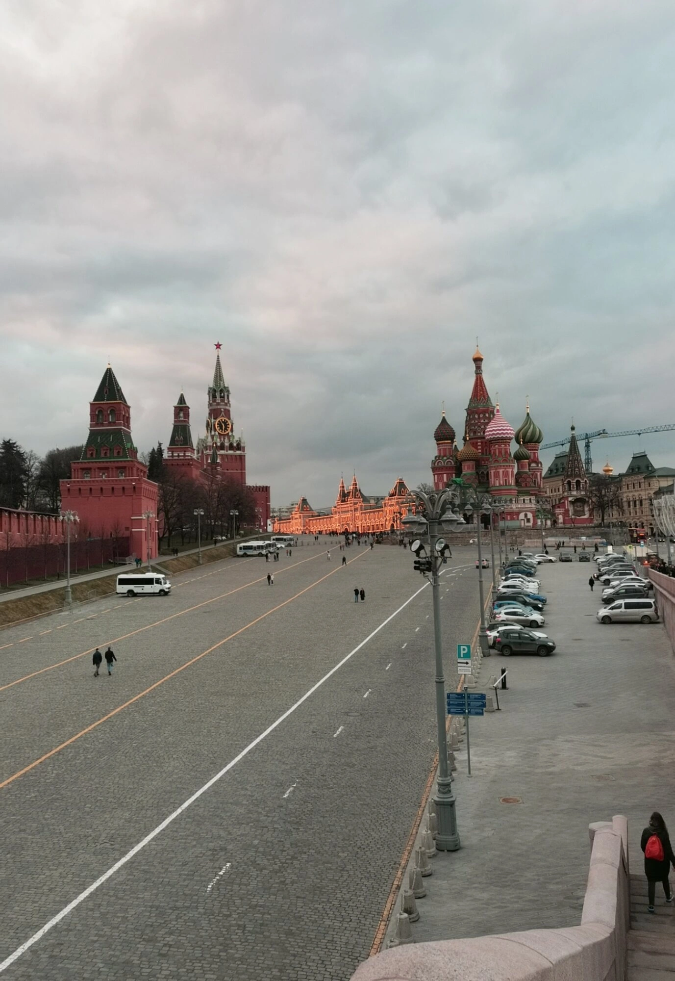 В левой части изображения простирается зубчатая стена Московского Кремля, а ближе к центру возвышается Спасская башня с знаменитыми курантами. Эта проездная башня, построенная в 1491 году, на протяжении веков служила главным парадным въездом в крепость. Перед храмом и кремлёвской стеной лежит широкая площадь, вымощенная брусчаткой. В пасмурный день, запечатлённый на фото, мягкий рассеянный свет выхватывает из серости богатство красок и деталей храмового узорочья, а включённые уличные фонари создают атмосферу затишья. На площади видны немногочисленные пешеходы и транспорт, что подчёркивает монументальность и вневременной характер исторического ансамбля. Перспектива, выбранная фотографом, позволяет оценить гармоничное соотношение масштабов собора, кремлёвских укреплений и открытого пространства площади, составляющих единый объект Всемирного наследия ЮНЕСКО.