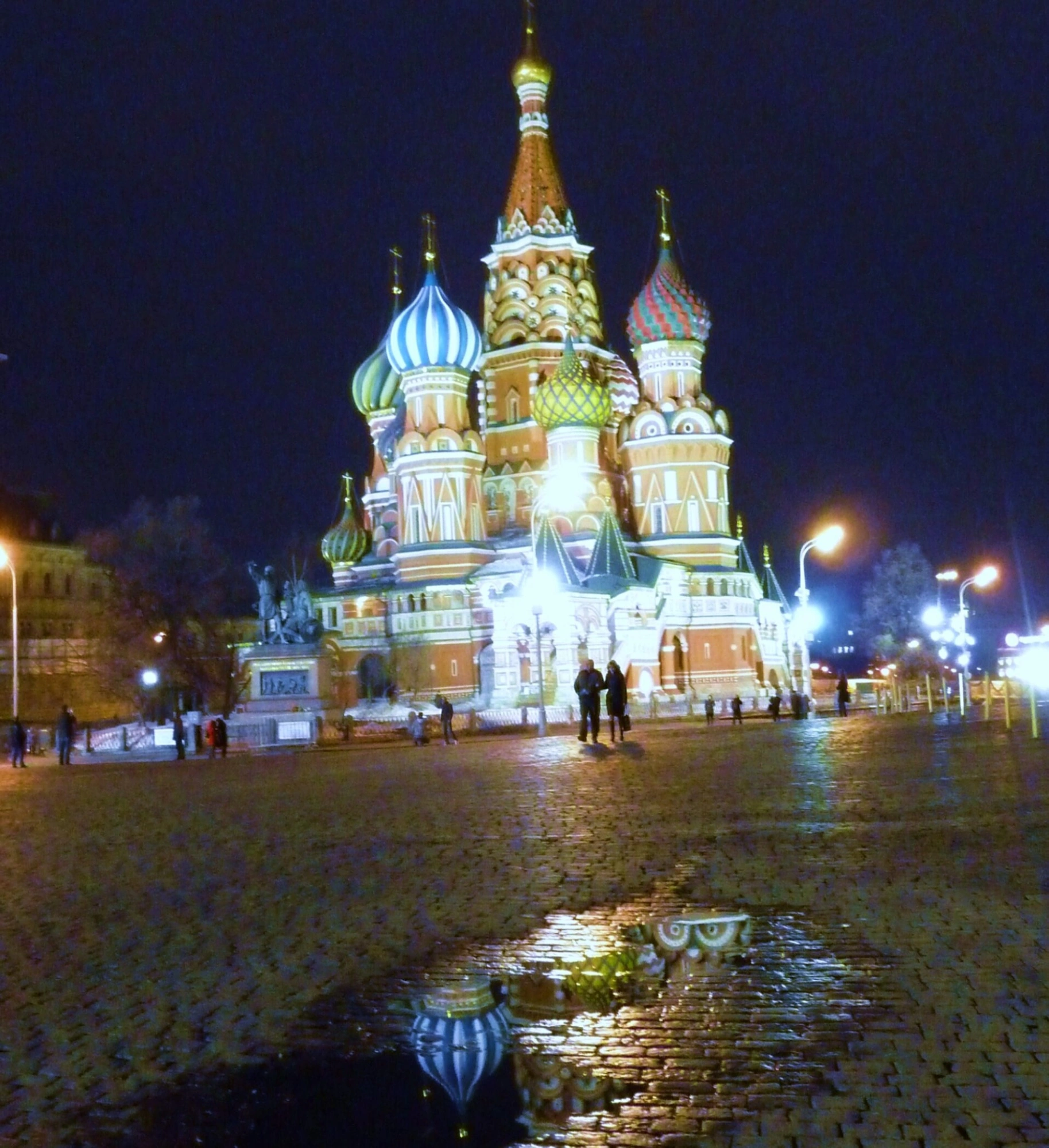 На снимке тёплое сияние уличных фонарей и специальной архитектурной подсветки мягко ложится на краснокирпичные фасады, украшенные аркатурными поясами и килевидными кокошниками. Особую живописность кадру придаёт лужа на вековой брусчатке Красной площади, в которой отражаются цветные главы и световые блики, удваивая красоту архитектурного чуда. На дальнем плане можно заметить фигуры людей, что подчёркивает масштаб и общественное значение этого места как центра духовной и культурной жизни.