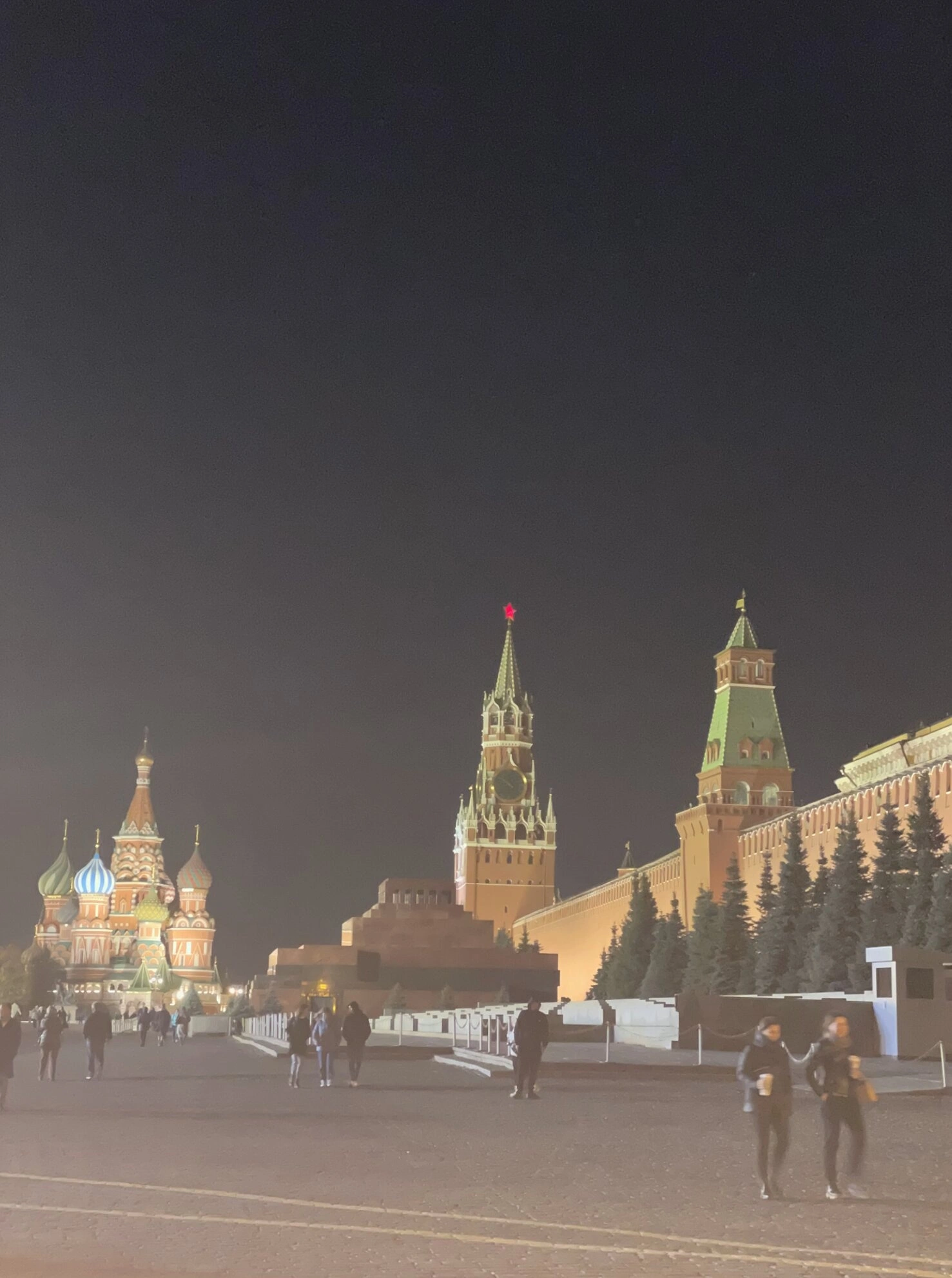 На снимке слева от собора видна грозная Спасская башня Московского Кремля — главная его проездная башня, увенчанная рубиновой звездой. В ночной тишине её знакомый силуэт, знакомый каждому по бою курантов, выступает как молчаливый страж исторического пространства площади. Перспектива, выбранная фотографом с уровня земли, позволяет ощутить необъятную ширь Красной площади и оценить истинный масштаб и духовную высоту священного сооружения. На переднем плане и вдали едва различимы небольшие силуэты людей, что лишь усиливает ощущение величия и вечности, исходящее от освещённого храма. Их присутствие подчёркивает, что это не просто памятник, а живой символ веры и истории, продолжающий собирать у своих стен православных людей и всех, ищущих духовной красоты.
