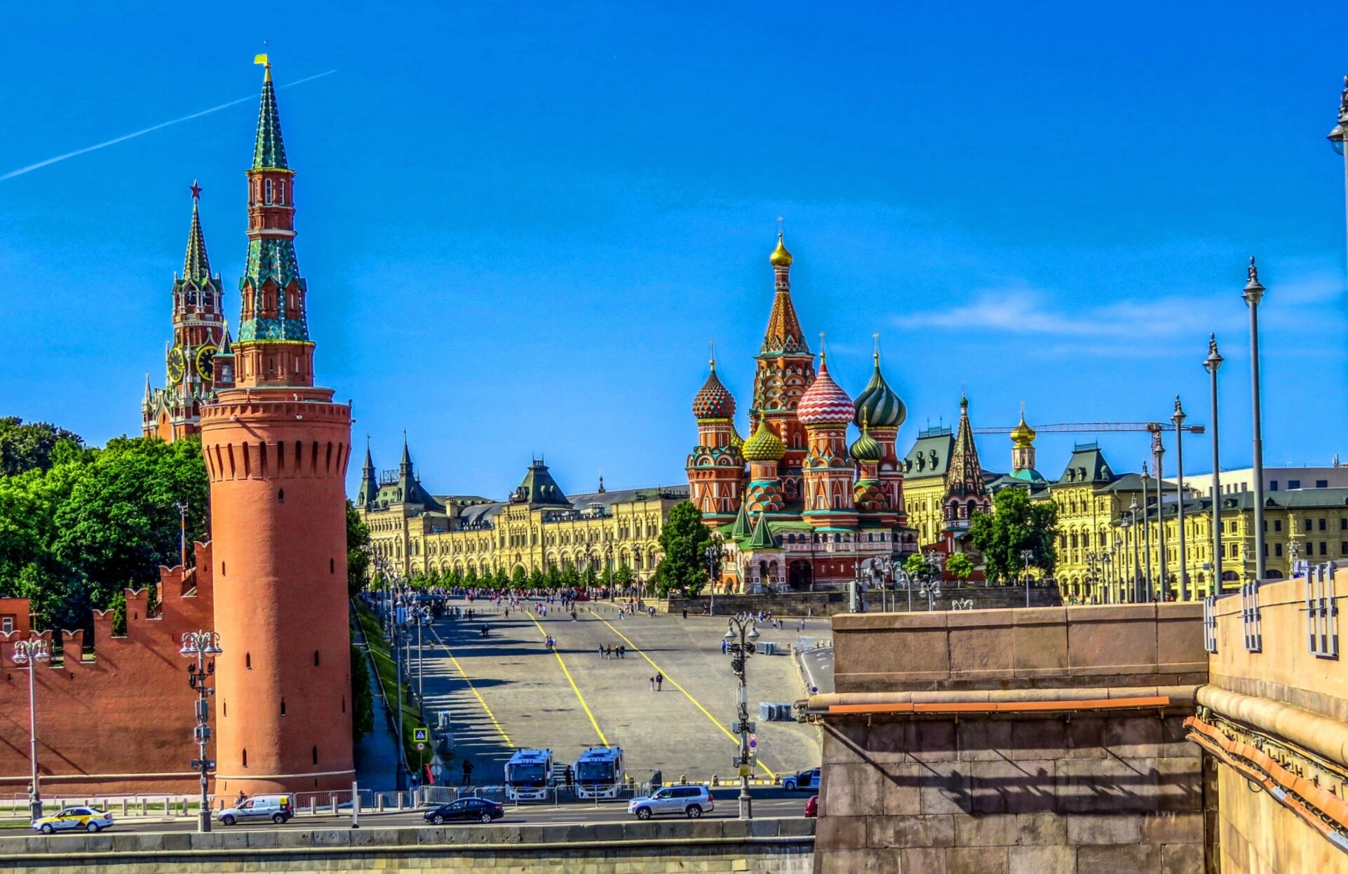 Представленная фотография запечатлела один из самых узнаваемых символов России — Собор Покрова Пресвятой Богородицы, что на Рву, более известный в народе как собор Василия Блаженного. Святыня возвышается на историческом месте — у южного края Красной площади в Москве, непосредственно над спуском к набережной Москвы-реки. Панорамный ракурс, вероятно взятый с Большого Москворецкого моста, позволяет охватить всё великолепие этого архитектурного шедевра и его гармоничную связь с ансамблем главной площади страны.