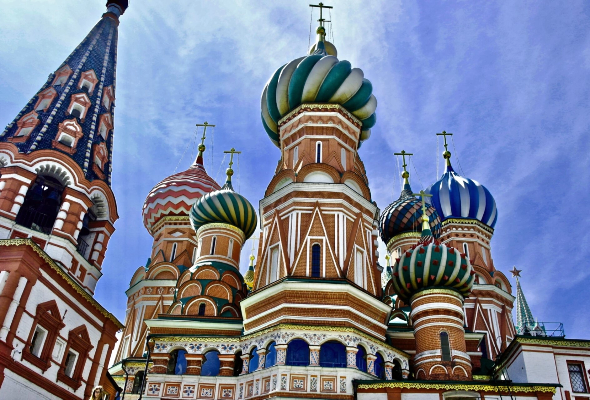 Снимок, сделанный с нижнего ракурса, позволяет в полной мере ощутить величественность и устремлённость богородичного храма ввысь. Каменные фасады, сложенные из красного кирпича и украшенные белоснежным резным узорочьем, арочными окнами и многочисленными кокошниками, предстают во всём своём праздничном убранстве. Особую благодать и узнаваемость собору придают уникальные луковичные главы, каждая из которых неповторима. Центральная шатровая церковь увенчана куполом с витым узором, а окружающие её церковные главки сияют в солнечных лучах яркими красками: золотом, зелёным, красным, синим и жёлтым, будучи украшенными геометрическими и растительными орнаментами. Все они осеняются златоглавными православными крестами. Слева отчётливо виден многоярусный шатровый шпиль одной из придельных церквей, также богато декорированный.