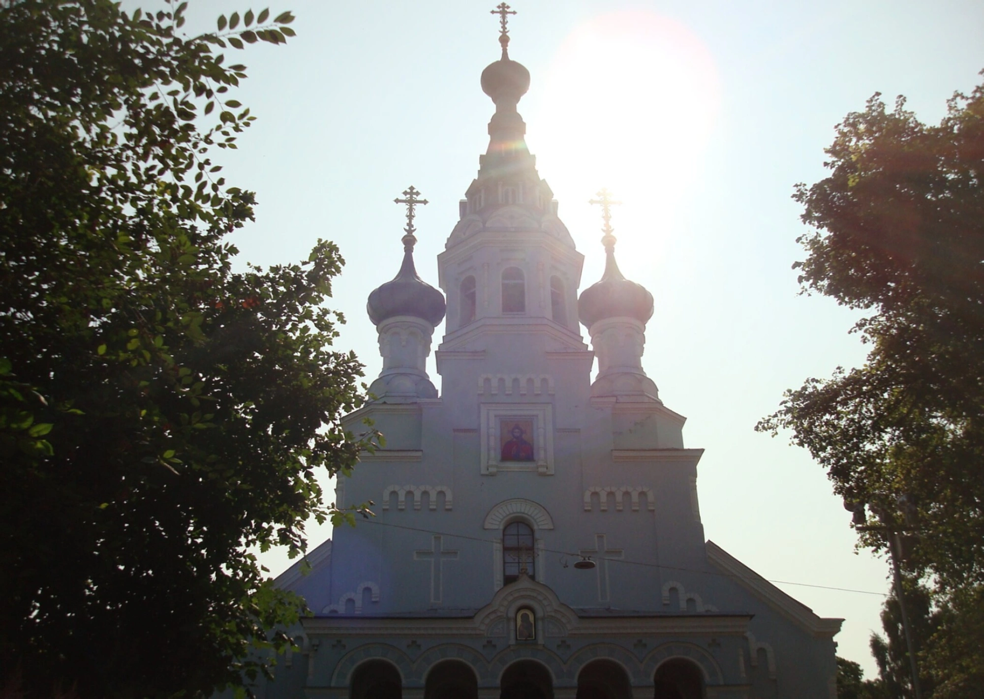 На представленной фотографии запечатлён солнечный лик возрождённой святыни — Собора Владимирской иконы Божией Матери в граде Кронштадте. Яркое дневное светило, расположенное над центральным куполом, озаряет своим благодатным светом светлый фасад храма, подчеркивая изящество архитектурных деталей и создавая дивную игру контрастов с обрамляющей здание сочной зеленью деревьев. Фотография являет взору главный, западный фасад собора. Его венчают три благолепные главы, увенчанные златоглавными крестами: центральная, самая высокая, и две меньшие по сторонам. Над входом простираются арочные проёмы, а выше, в центральной части, в арочной нише помещён святой образ — икона, незримо осеняющая всех входящих под кров церковный.