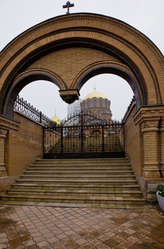 Снимок captures массивную кирпичную арку с ажурными коваными воротами, которые ведут к широкой лестнице, устремлённой вверх к собору. За ними возвышается монументальное здание из красного кирпича, увенчанное золотыми куполами, сияющими на солнце. Его архитектурный облик, выполненный в неовизантийском стиле, напоминает о традициях древнерусского и византийского церковного зодчества, символизируя непрерывность православной веры.