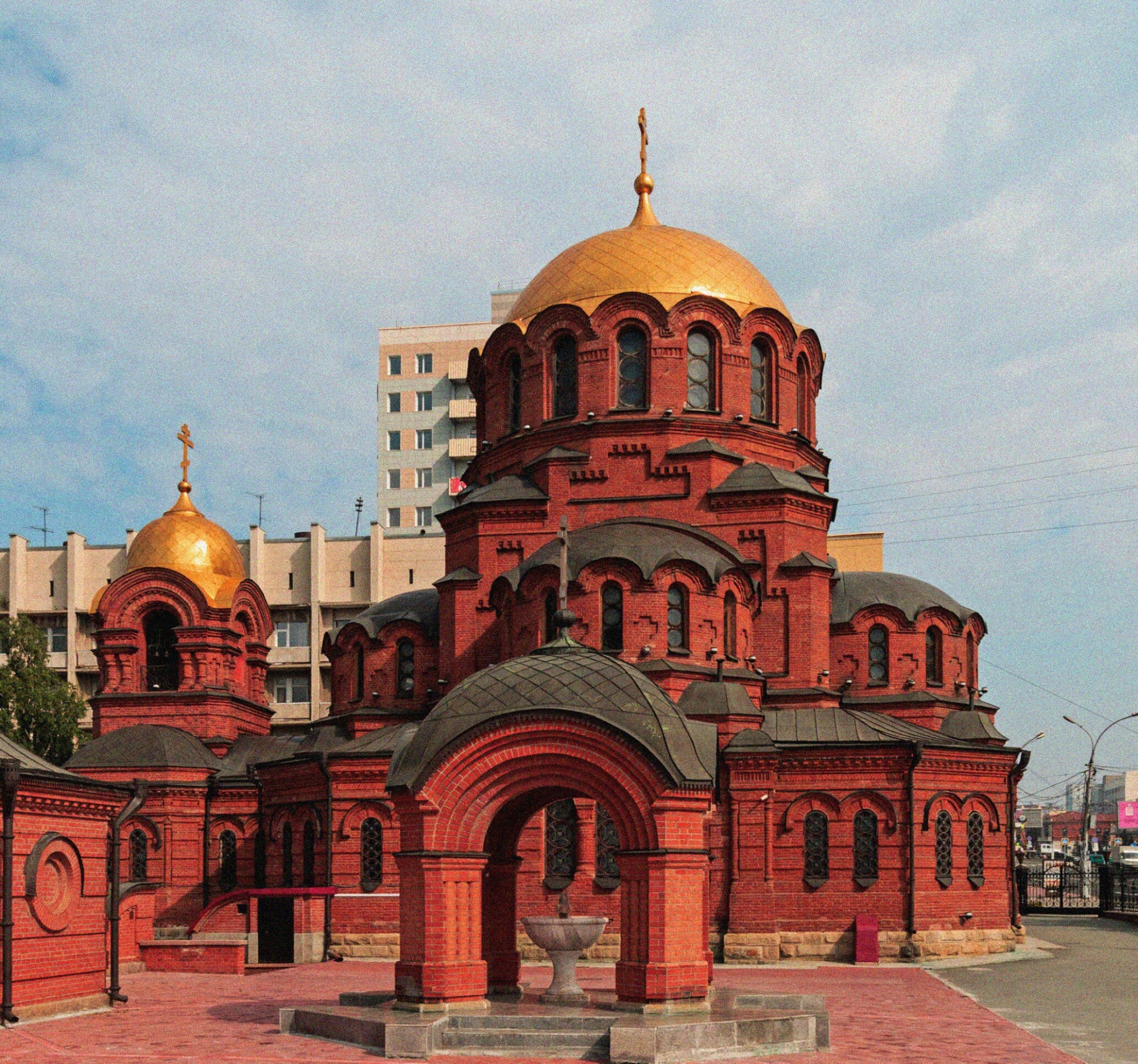 На представленной фотографии запечатлён величественный Собор во имя святого благоверного князя Александра Невского, являющийся одним из символов духовной жизни Новосибирска. Этот православный храм, возведённый в 1898 году, по праву считается одним из первых каменных строений nascent города и имеет статус объекта культурного наследия.
