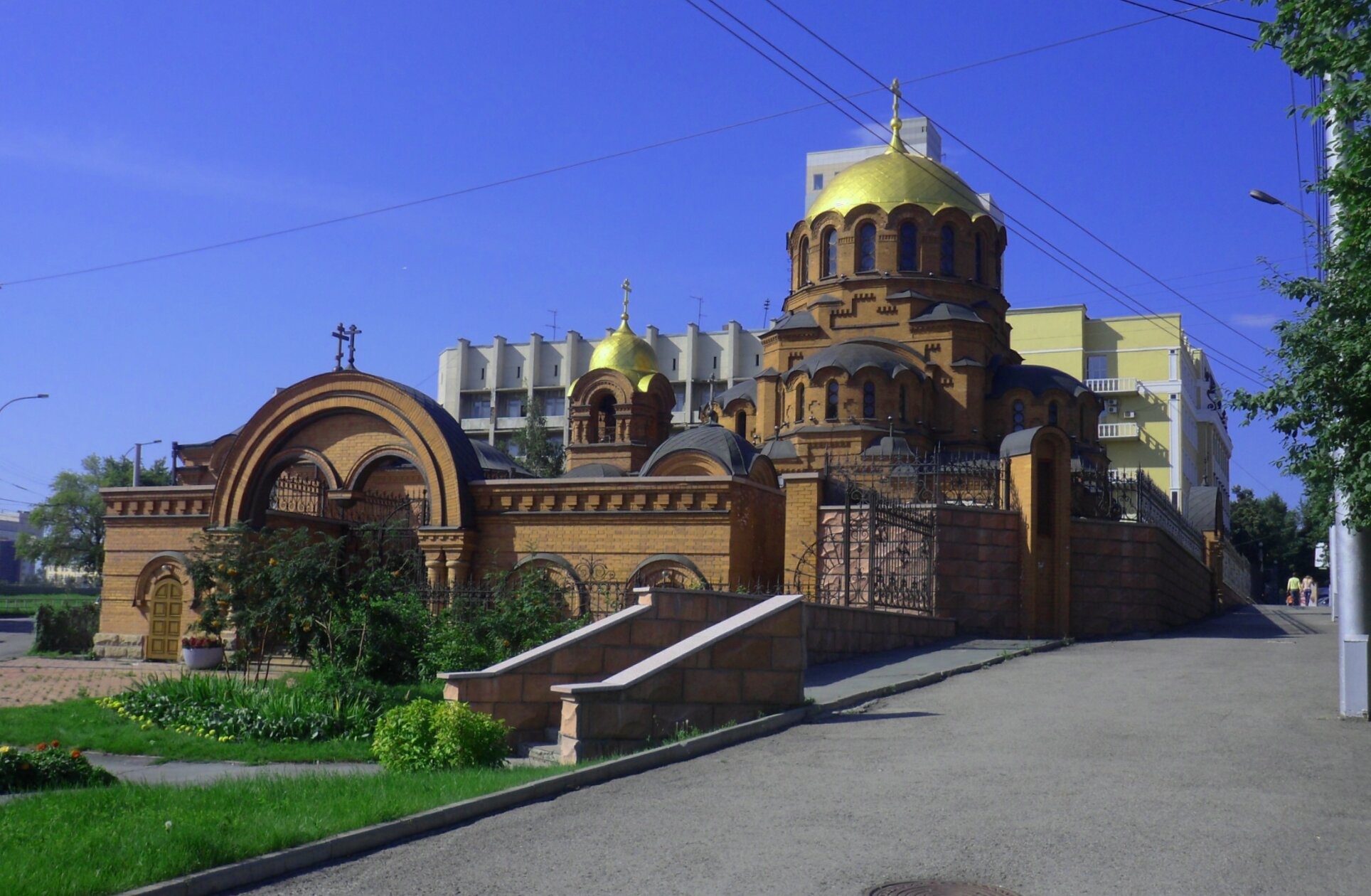 На фотографии запечатлён один из старейших и наиболее почитаемых православных храмов Новосибирска — собор во имя святого благоверного князя Александра Невского. Величественное каменное здание, возведённое в неовизантийском стиле, доминирует в окружающем пространстве, что подчёркивается его расположением на возвышении. Золочёные купола, венчающие храм, сияют под лучами солнца, символизируя небесный свет и благодать.