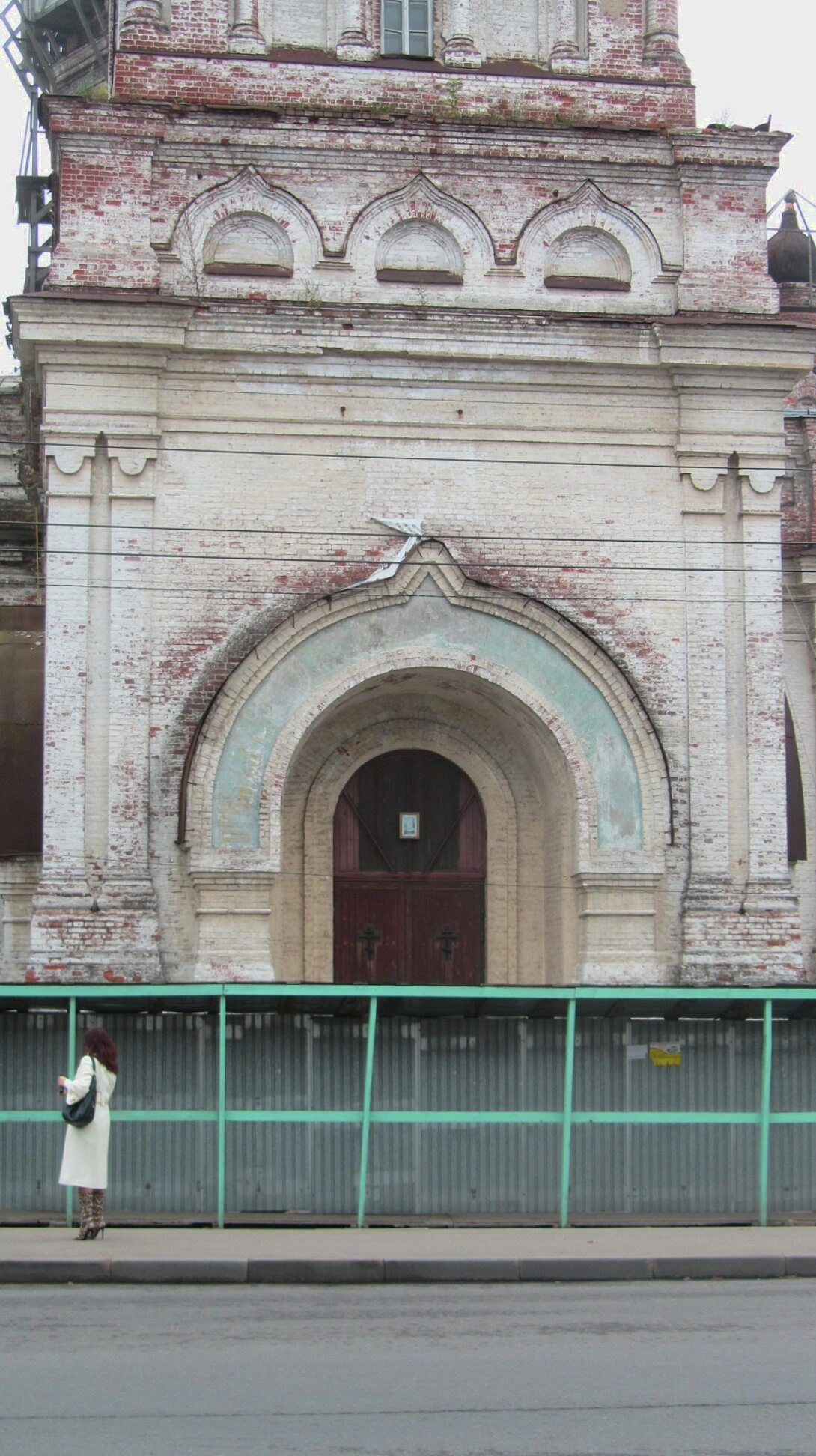 Рядом с ограждением храма запечатлён человек в светлой одежде, что позволяет оценить масштаб сооружения. Собор Воскресения Христова в Луге имеет богатую историю, пережил годы забвения в советский период и ныне возрождён для верующих. В храме регулярно совершаются богослужения, сохраняются чтимые иконы и православные святыни.