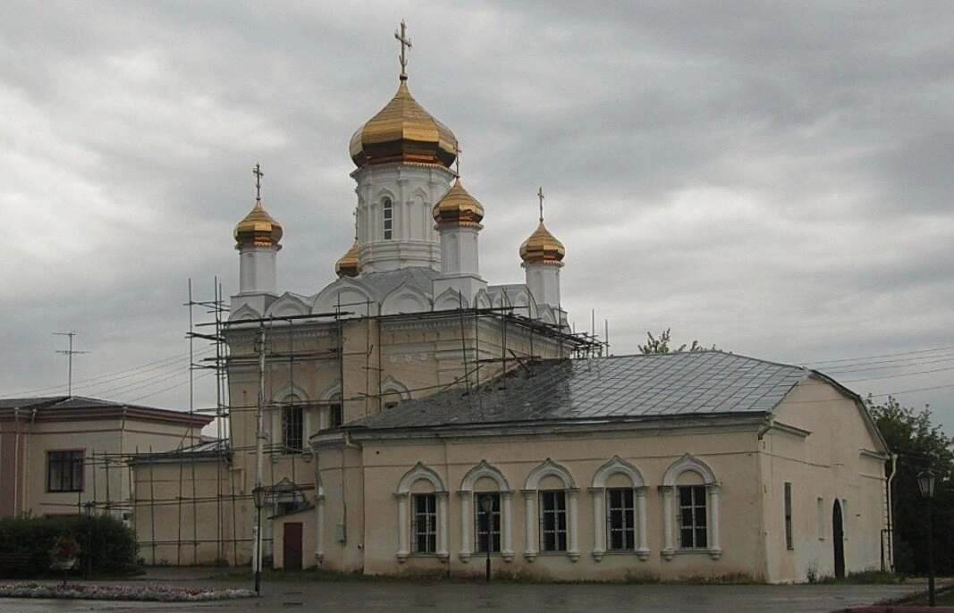 Величественное белоснежное здание увенчано пятью главами, центральная из которых, символизирующая Христа, выделяется своими большими размерами и позолоченной главкой с установленным на ней крестом. Четыре меньшие главки, обозначающие четырёх евангелистов, гармонично дополняют композицию. На снимке хорошо видно, что фасад собора в нижней части окружён строительными лесами, что свидетельствует о проведении активных реставрационно-восстановительных работ, направленных на сохранение этого духовного и культурного наследия для будущих поколений.