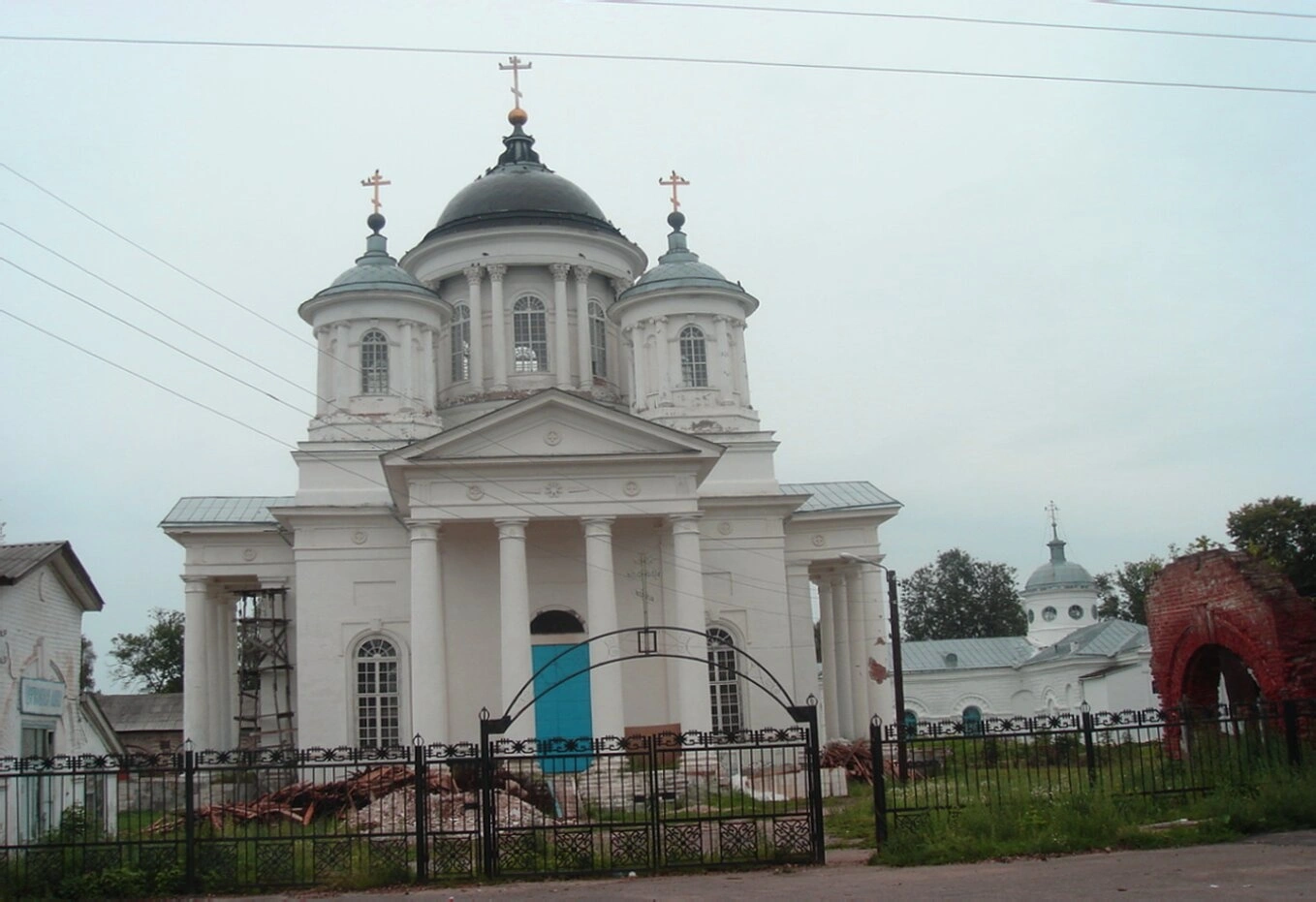 Собор, возведённый в первой половине XIX века, имеет богатую историю и является неотъемлемой частью духовной жизни Лысково. Он пережил годы лихолетья и забвения, но ныне, благодаря трудам реставраторов и попечителей, вновь обретает своё предназначение. Храм окружён невысокой оградой, за которой виднеется зелёная растительность, а пасмурное небо на фотографии придаёт особую, глубокую атмосферу духовной сосредоточенности и величия.