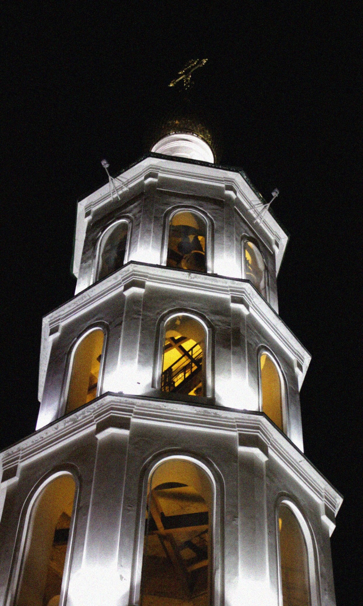 Ночная подсветка подчеркивает архитектурное совершенство колокольни, выделяя ее в качестве одной из духовных доминант города. Этот снимок передает не только красоту храмовой архитектуры, но и символизирует свет веры, сияющий во тьме.