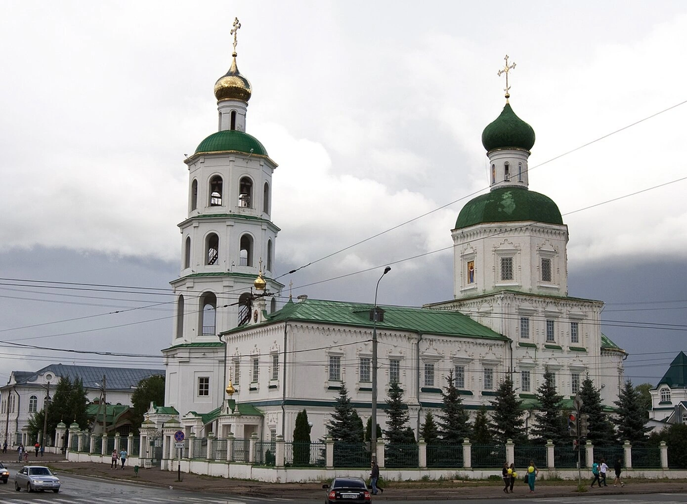 На фотографии запечатлён величественный Собор Вознесения Господня, являющийся одним из старейших и наиболее почитаемых православных храмов столицы Республики Марий Эл — города Йошкар-Олы. Этот кафедральный собор имеет богатую историю, берущую начало в XVIII веке, и представляет собой выдающийся памятник русской церковной архитектуры.