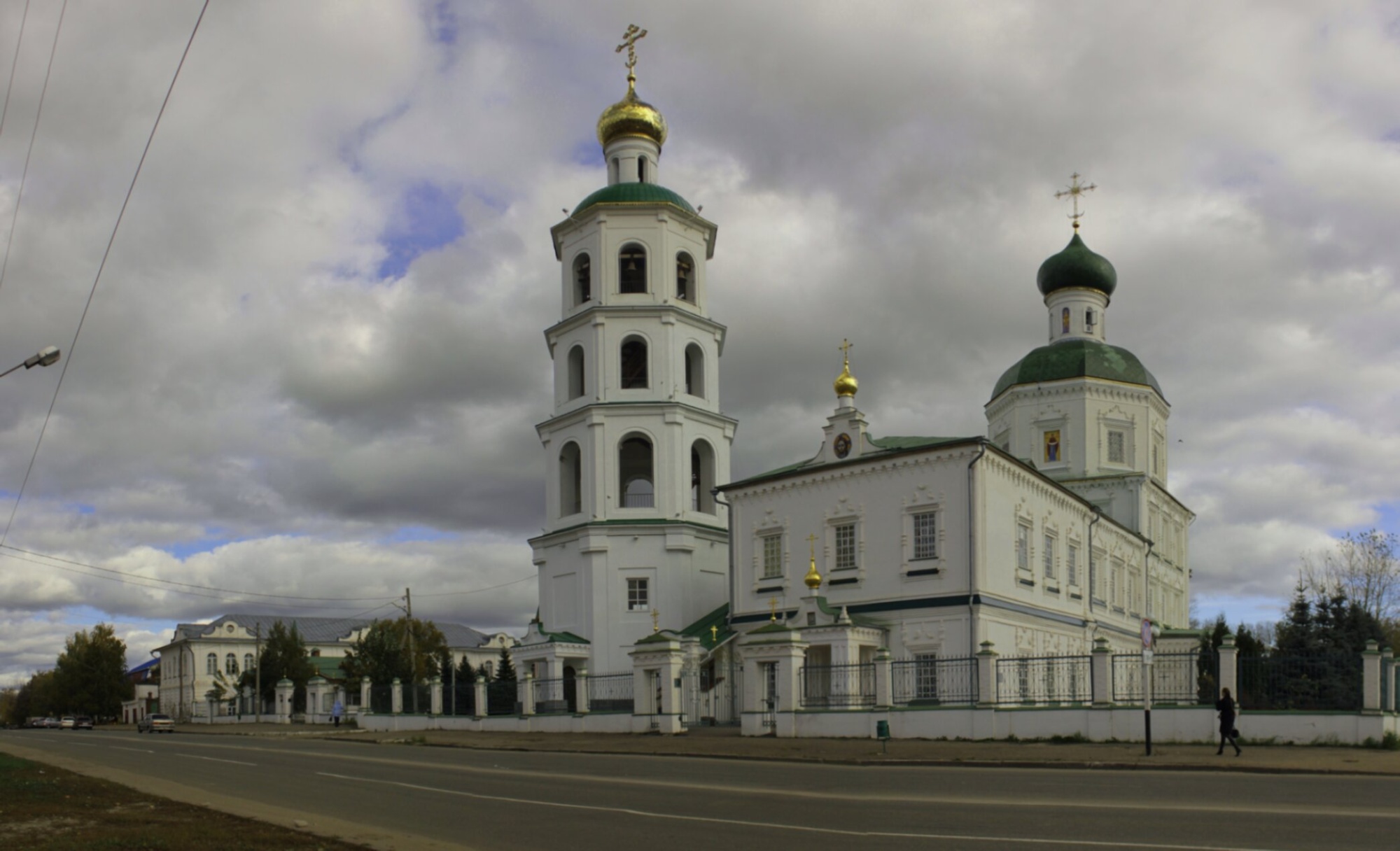 Собор, обнесённый оградой, стоит в окружении городской застройки, гармонично сочетая сакральное значение с повседневной жизнью города. На переднем плане можно видеть дорогу, напоминающую о том, что храм открыт для каждого путника. Архитектурные детали — наличники, кокошники и узорчатые элементы — подчёркивают мастерство русских зодчих и придают зданию неповторимый благолепный вид.