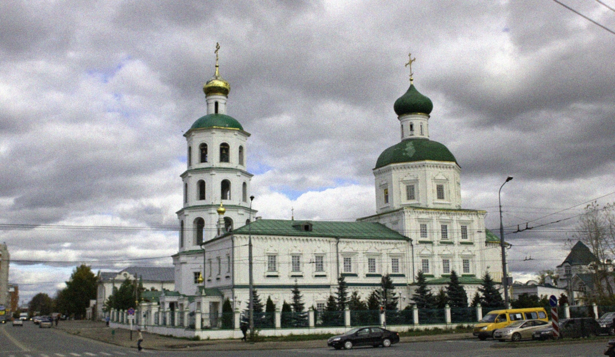 На фотографии запечатлён величественный Собор Вознесения Господня, являющийся одним из старейших православных храмов Йошкар-Олы и выдающимся памятником русского церковного зодчества XVIII века. Его белоснежные стены и устремлённая в небо многоярусная колокольня создают неповторимый архитектурный облик, формирующий исторический силуэт города.