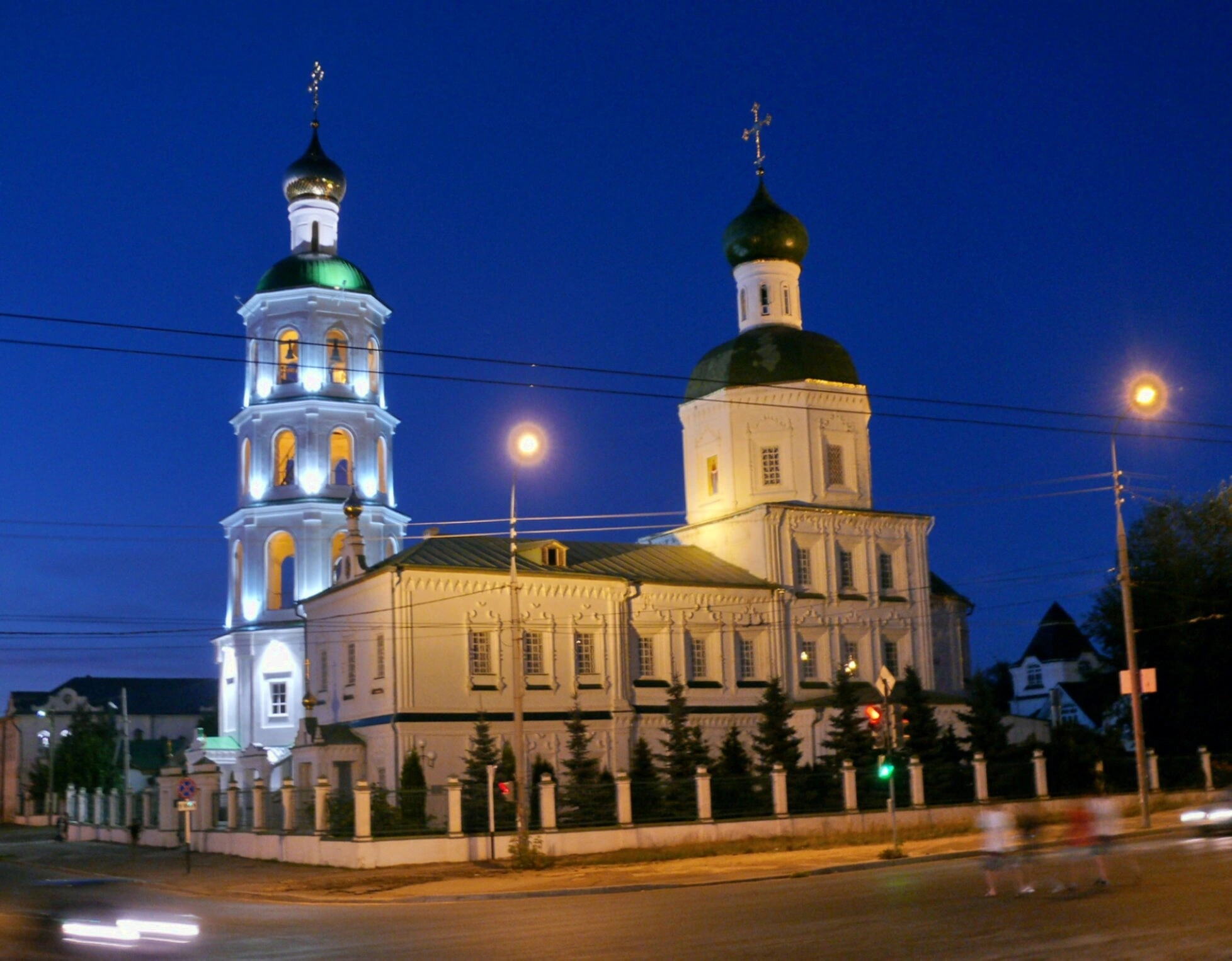 На представленной фотографии запечатлён величественный облик Собора Вознесения Господня — старейшего каменного храма Йошкар-Олы, являющегося выдающимся памятником церковной архитектуры и духовным центром Марийского края. Ночная съёмка подчёркивает монументальность святого места: тёплый свет от окон и прожекторов озаряет белоснежные стены и черепичные кровли, создавая атмосферу благоговейного спокойствия и величия.