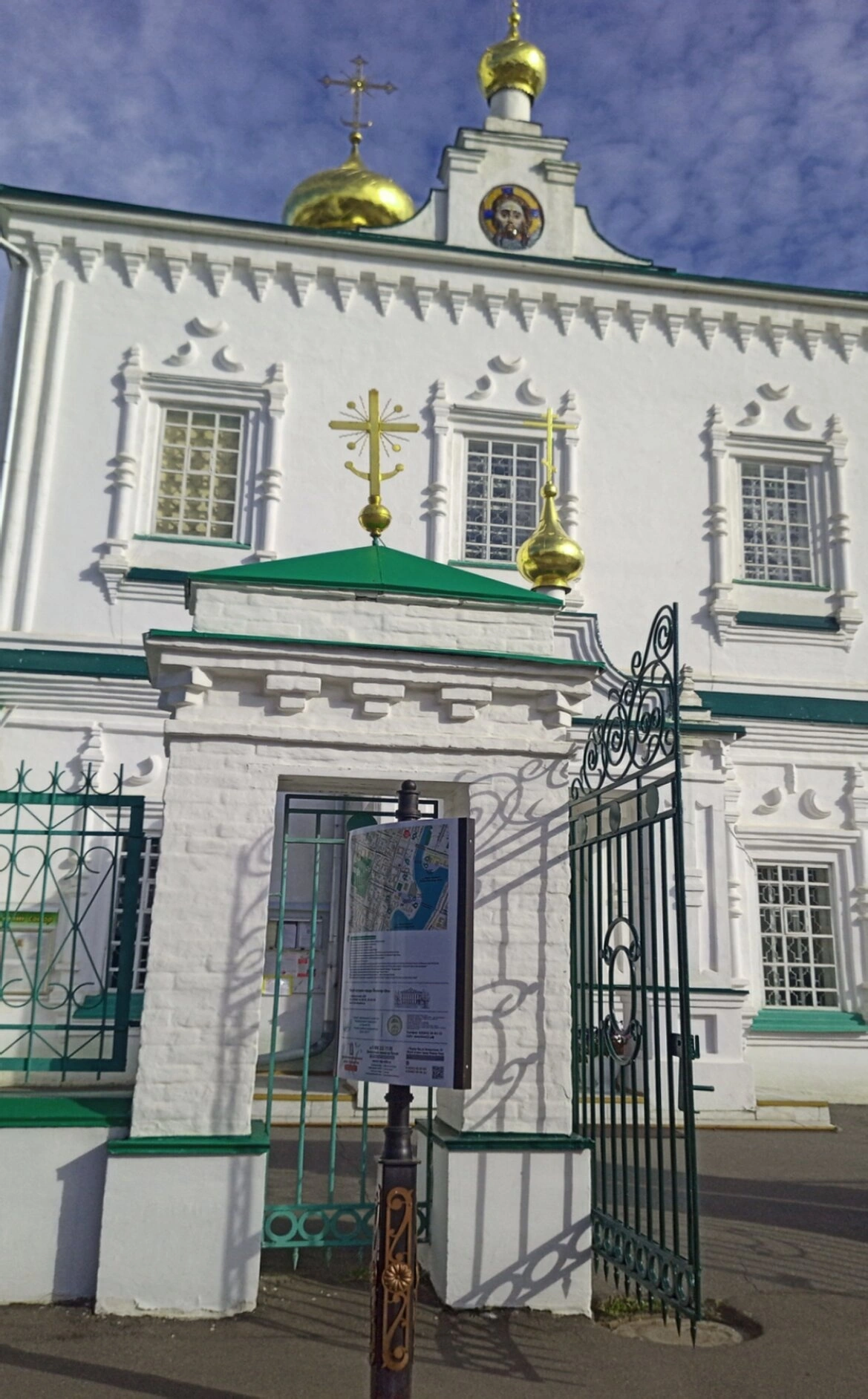 На переднем плане фотографии видна ажурная кованая ограда, выкрашенная в благодатный зелёный цвет, которая символически отделяет мирскую суету от священного пространства храма. Рядом расположен информационный стенд для паломников и гостей собора.