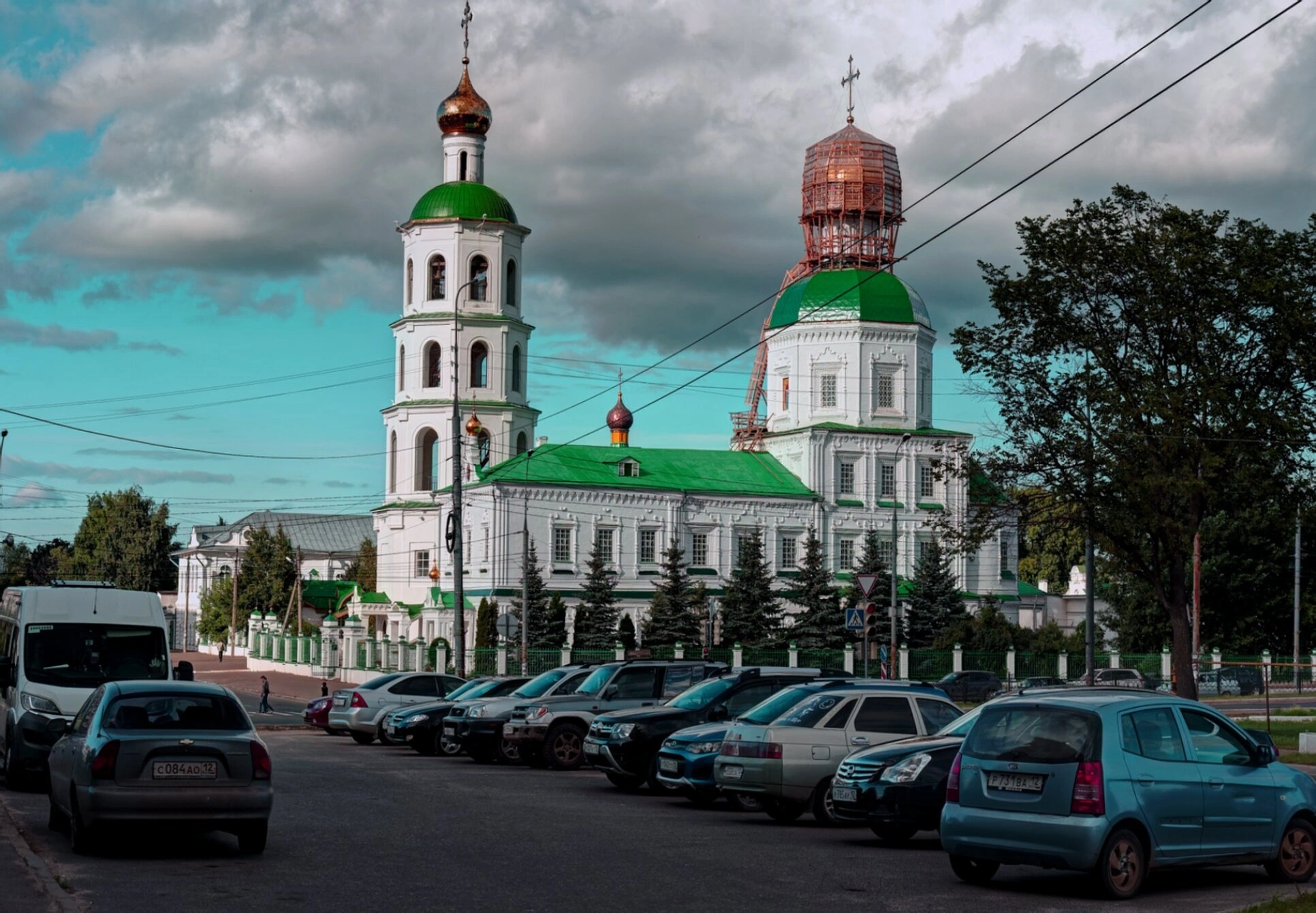 Перед собором видна благоустроенная территория с парковкой, а по периметру высажены хвойные деревья, создающие гармоничный природный фон. Справа от храма раскидистое дерево с густой листвой дополняет живописность святого места. На заднем плане просматриваются элементы городской инфраструктуры, подчёркивающие интеграцию храма в современную городскую среду.