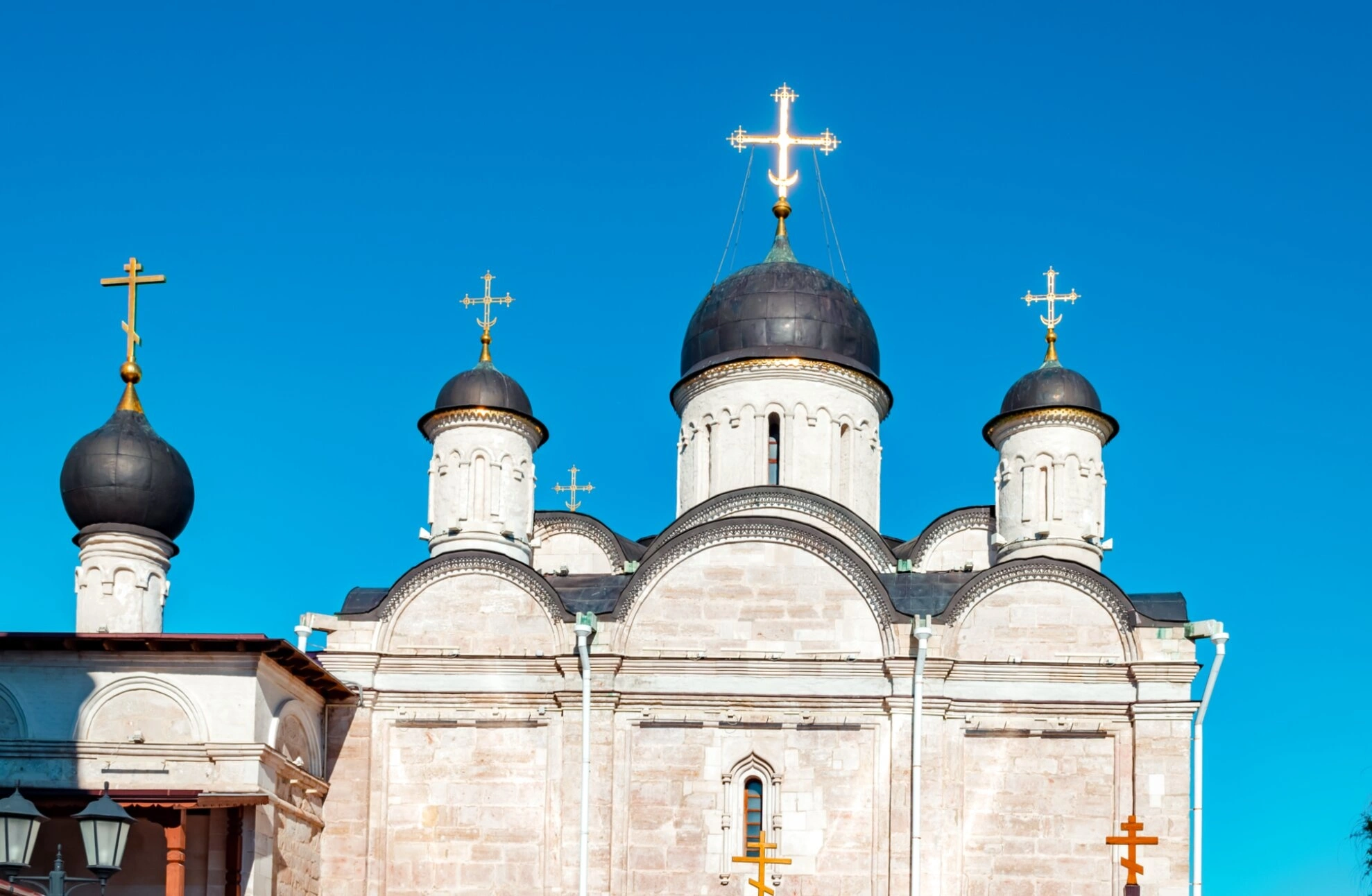 Собор, изображённый на снимке, представляет собой величественное каменное сооружение, увенчанное традиционным пятиглавием. Золотые купола-луковки, символизирующие Христа и четырёх евангелистов, гордо возносятся к небу, а установленные на них православные кресты осеняют собой всю округу. Фасад храма отличается строгостью и благолепием, характерными для церковного зодчества. Белоснежные стены контрастируют с тёмными кровлями и позолотой глав, создавая образ неземной красоты и духовной твердыни.