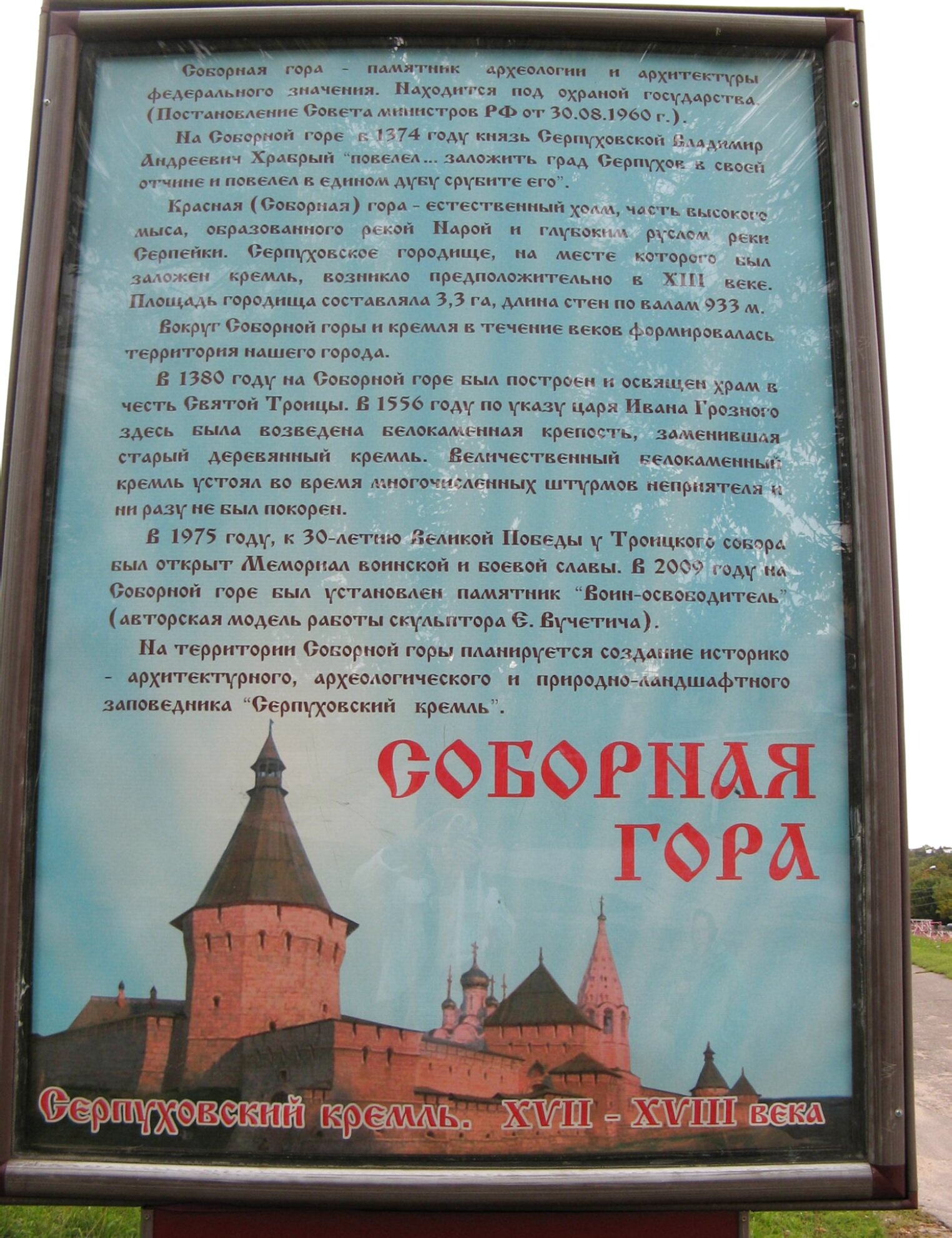 На фотографии запечатлен информационный щит, установленный на Соборной горе в Серпухове — месте исключительной исторической и духовной значимости. Этот щит знакомит посетителей с богатым прошлым данного памятника археологии федерального значения, где переплелись судьбы древней крепости и православных святынь.