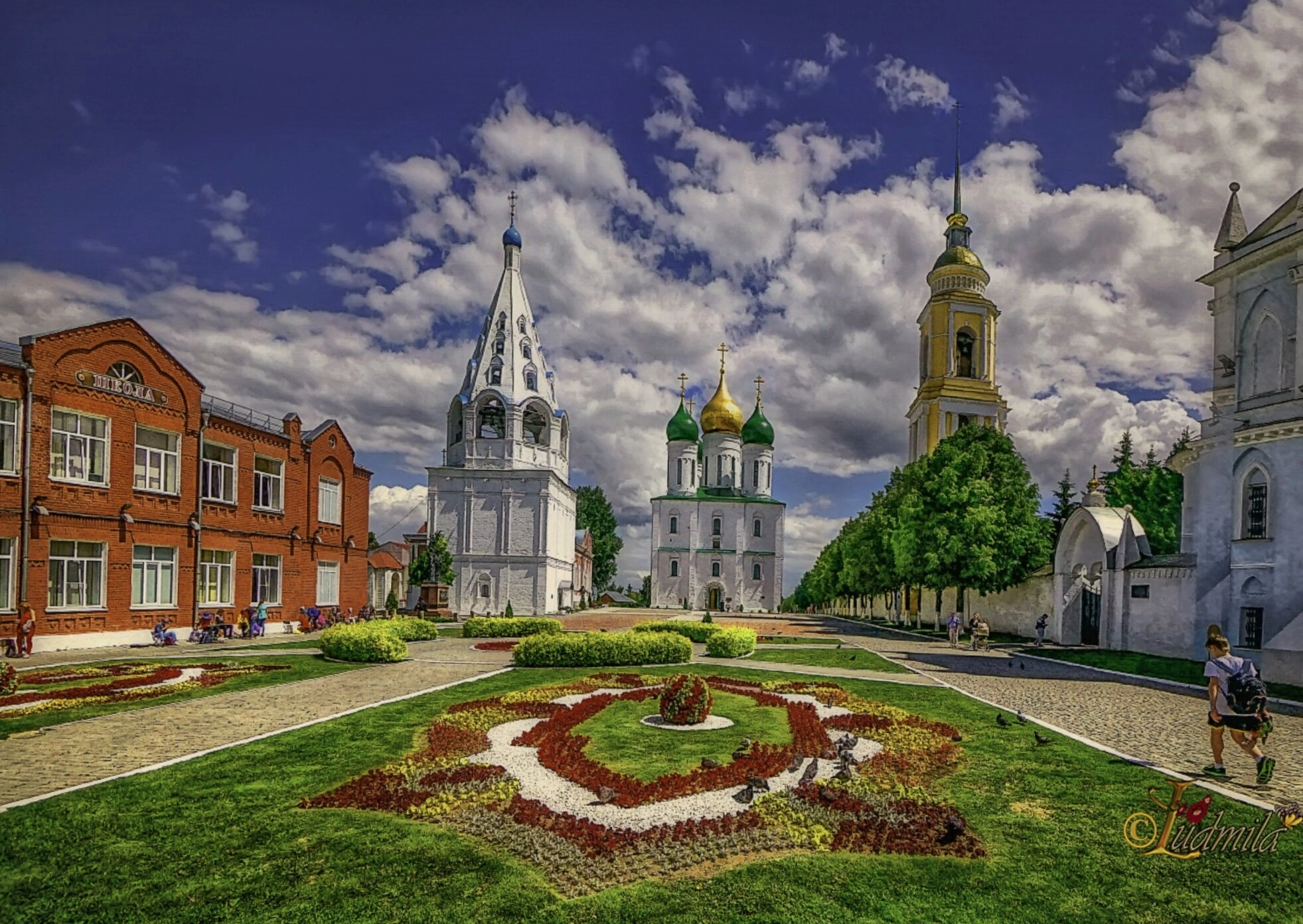 На представленной фотографии запечатлена Соборная площадь Коломенского кремля — исторический центр духовной жизни древнего города. В центре композиции возвышается величественный Успенский собор, построенный в 1672-1682 годах по указу царя Алексея Михайловича в память о победе над татаро-монголами. Пятиглавый храм с зелёными куполами является выдающимся памятником русского церковного зодчества XVII века.
