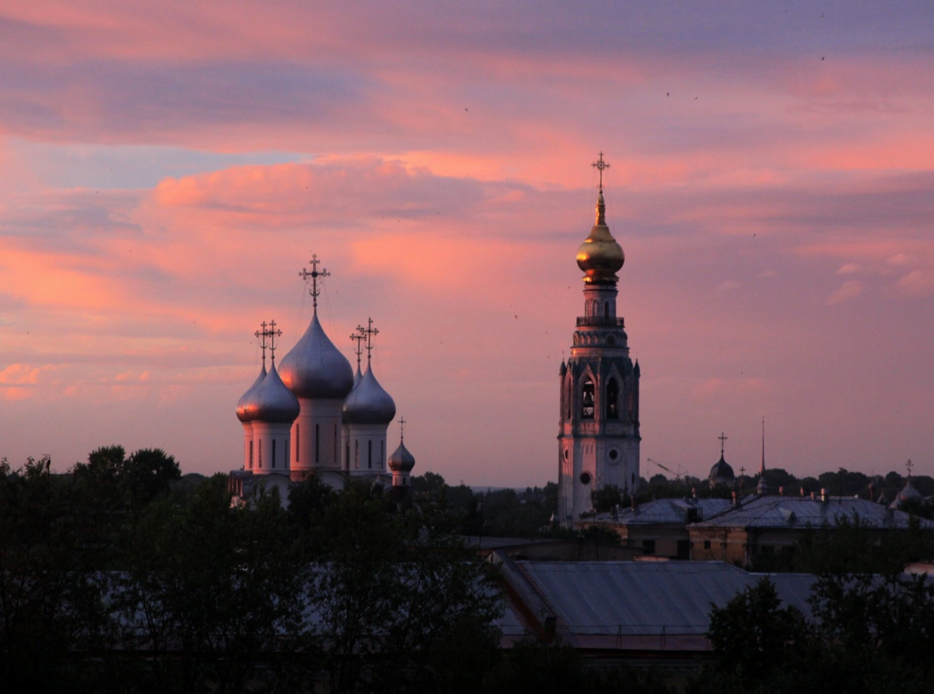 На представленной фотографии запечатлен величественный архитектурный ансамбль Софийского собора и его колокольни в историческом центре Вологды. Свято-Софийский кафедральный собор, расположенный на территории Вологодского кремля, является одним из древнейших каменных храмов Русского Севера. Пятиглавый собор, увенчанный серебристыми куполами с воздвигнутыми на них святыми крестами, предстает в мягком свете заходящего солнца, что придает святыне особое благолепие.