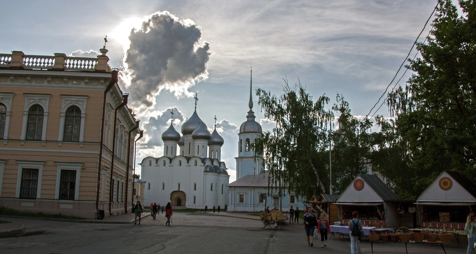 Слева от храмового комплекса просматривается двухэтажное здание с арочными оконными проёмами, характерное для исторической застройки Вологды. Справа расположены торговые ряды, где паломники и туристы могут приобрести церковную утварь и православные сувениры.