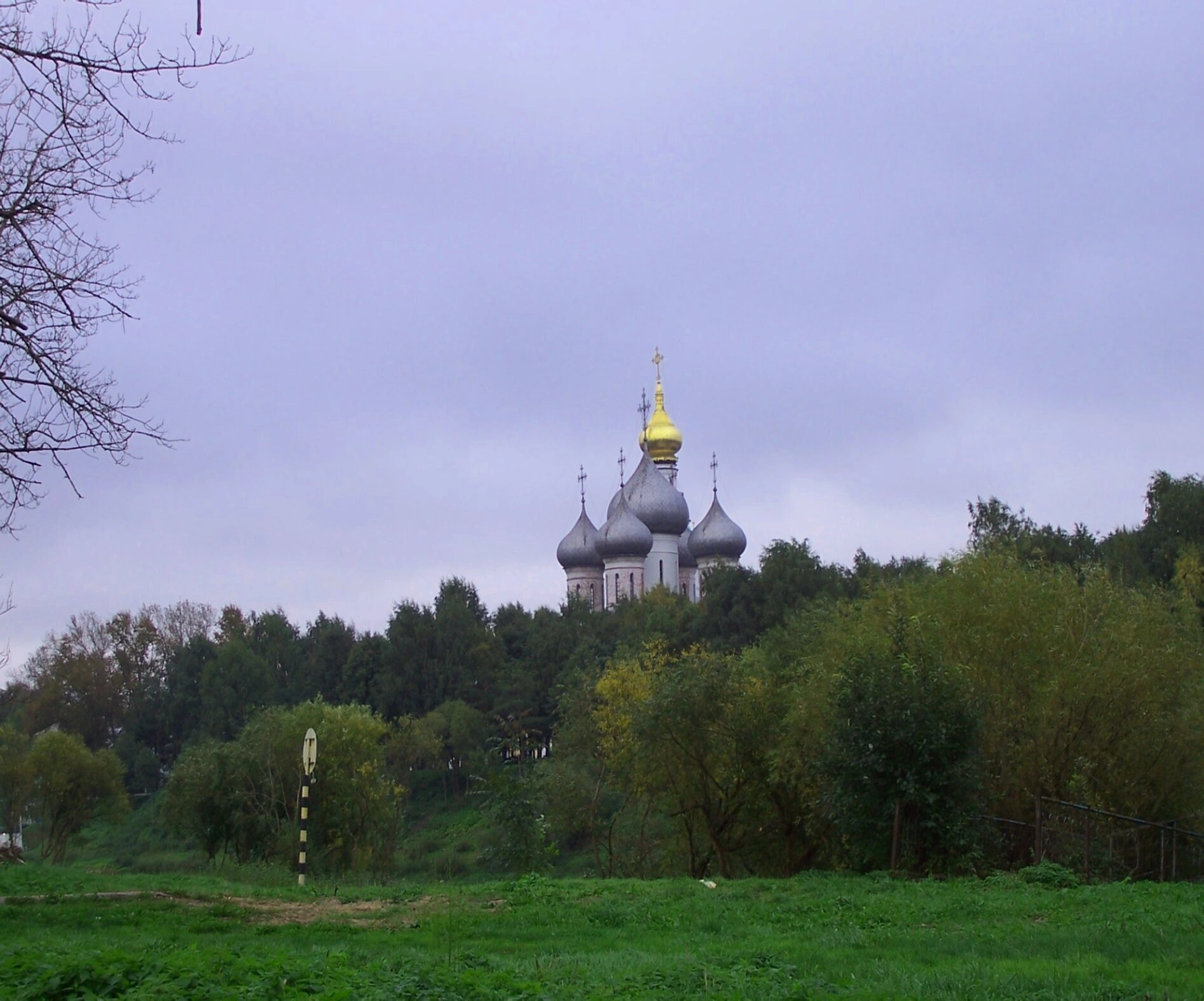 На представленной фотографии запечатлён кафедральный Софийский собор города Вологды, являющийся выдающимся памятником русского церковного зодчества. Снимок выполнен с некоторого расстояния, что позволяет оценить величественные пропорции храма и его доминирующее положение в городском ландшафте.