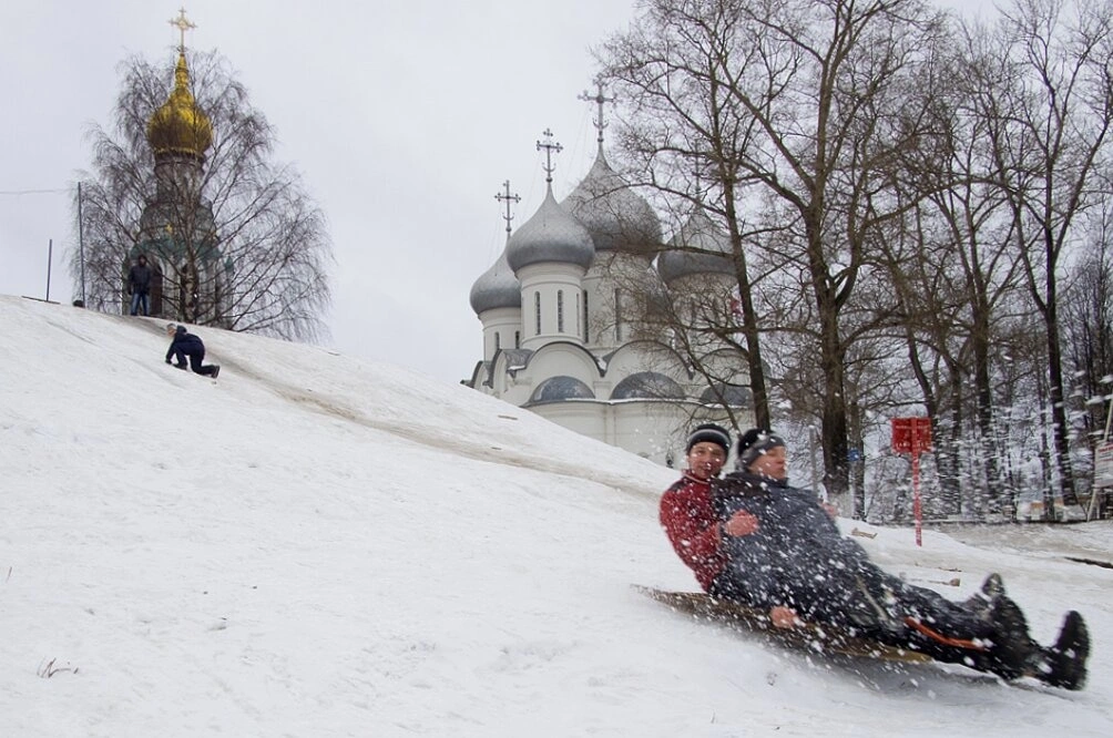 На переднем плане изображены двое мужчин, спускающихся с заснеженного холма на санях, что добавляет динамики зимнему пейзажу и передает особенности повседневной жизни в холодное время года. Фигуры людей не являются крупным планом, а органично вписаны в общую композицию снимка.