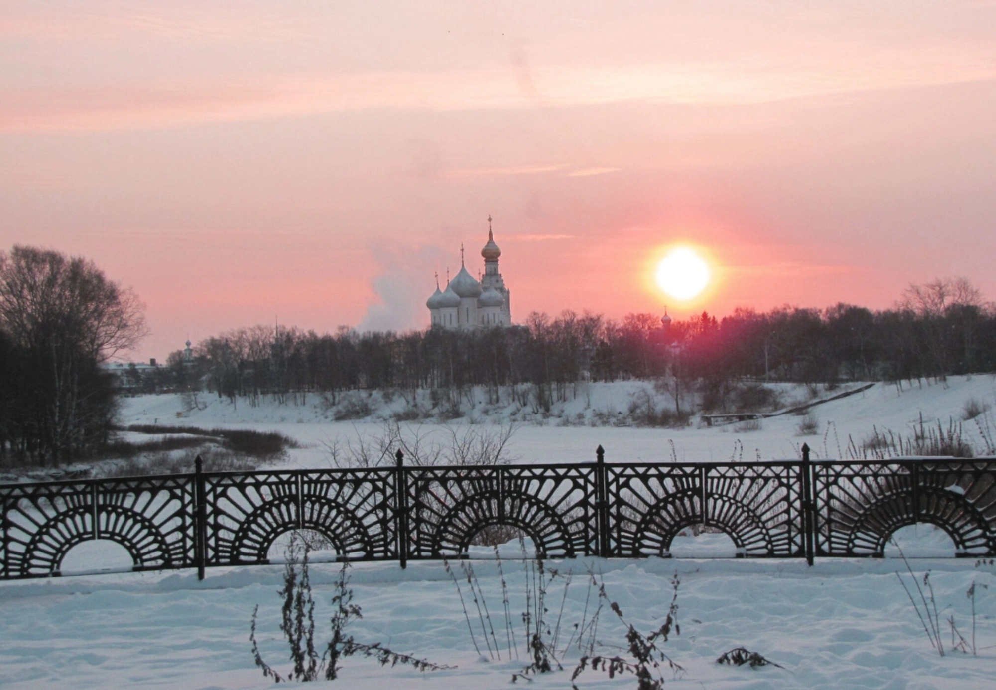 На представленной фотографии запечатлен величественный Софийский собор города Вологды в зимнее время на закате солнца. Снимок выполнен с противоположного берега реки Вологды, что позволяет оценить монументальность храмового сооружения и его гармоничное единение с окружающим природным ландшафтом.