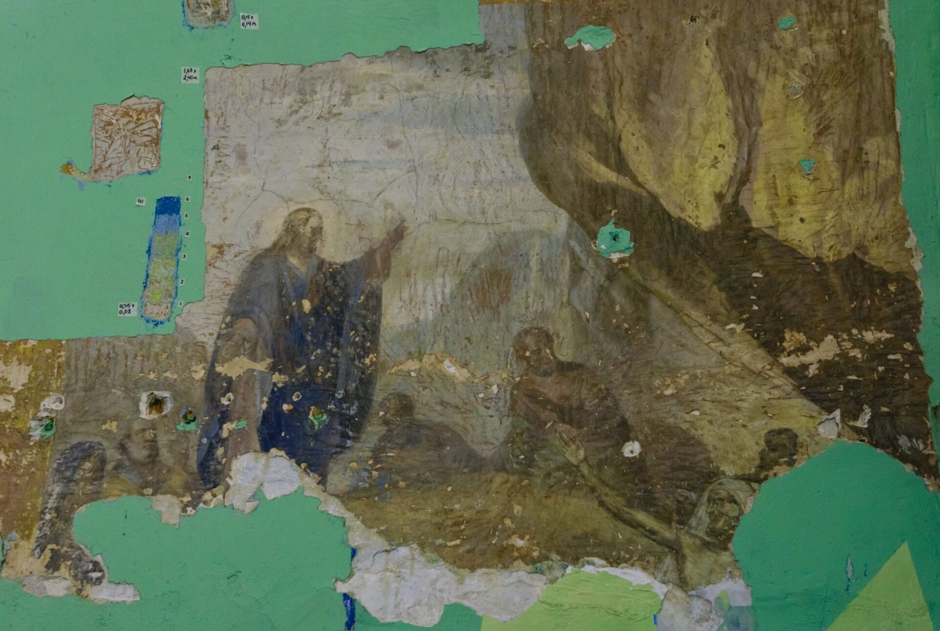 На представленной фотографии запечатлён фрагмент старинной настенной росписи, уцелевшей в Распятском соборе-колокольне, что расположен в городе Серпухове Московской области. Центральной фигурой в композиции является образ Господа Иисуса Христа, изображённого в традиционной иконографии с благословляющей десницей. Рядом с Ним просматриваются лики других святых или апостолов, чьи черты частично утрачены из-за повреждений штукатурного слоя.