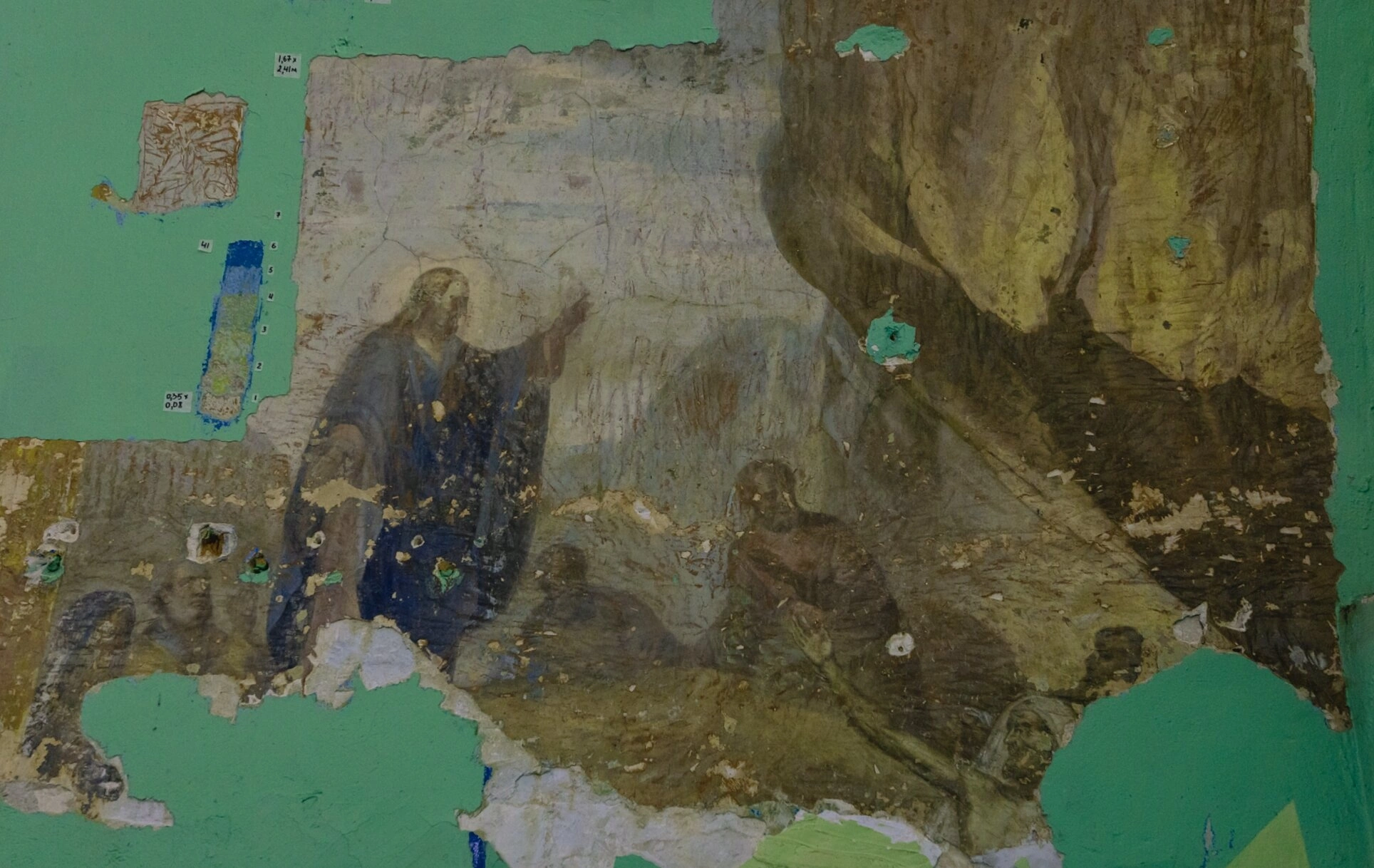 На представленной фотографии запечатлен уникальный фрагмент уцелевшей настенной росписи, сохранившейся на стене разрушенного Распятского собора, располагавшегося в Серпухове. Центральным сюжетом фрески является образ Господа нашего Иисуса Христа в окружении святых, что позволяет отнести её к числу особо ценных памятников православной монументальной живописи.